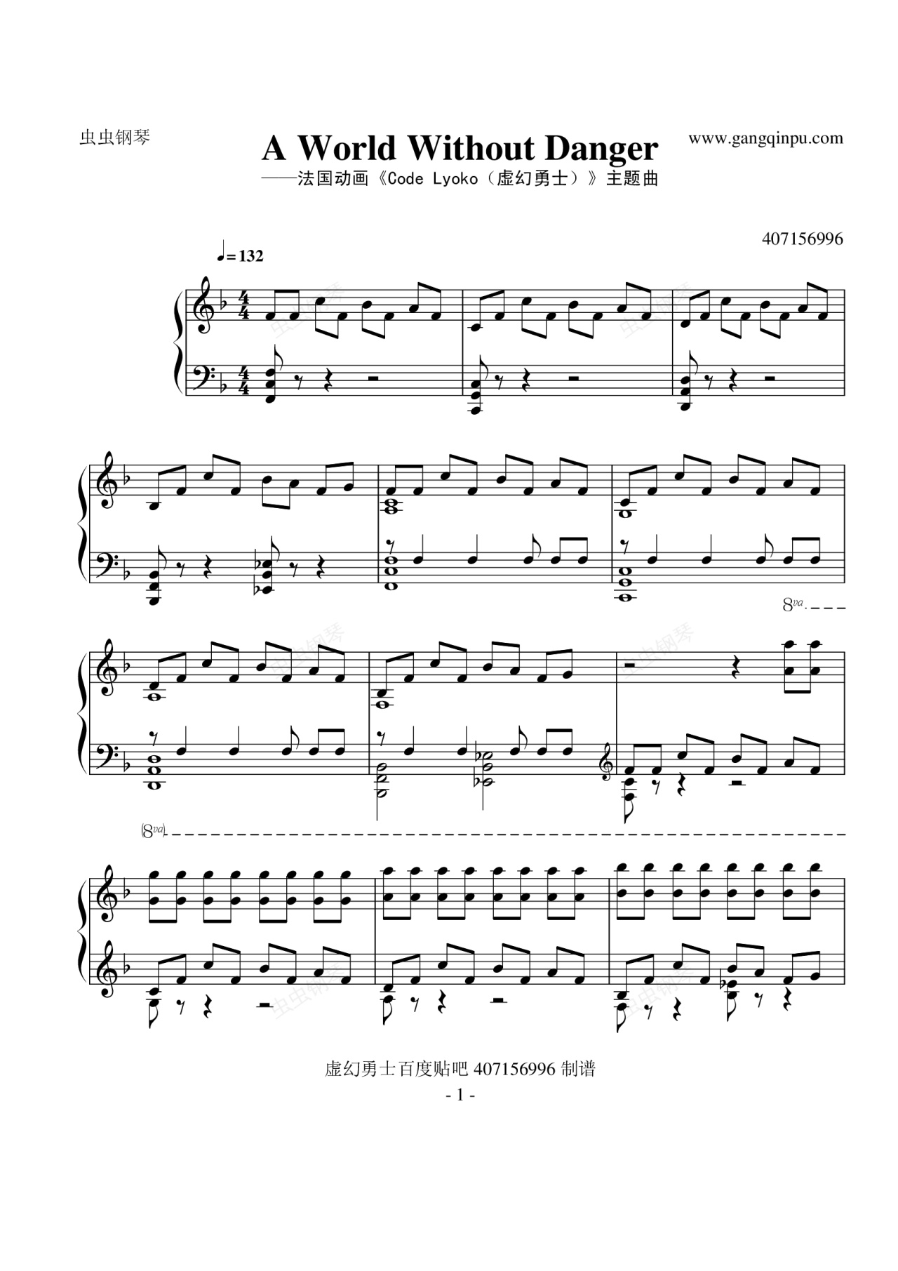 钢琴谱:法国动画《虚幻勇士》主题曲——A World Without Danger