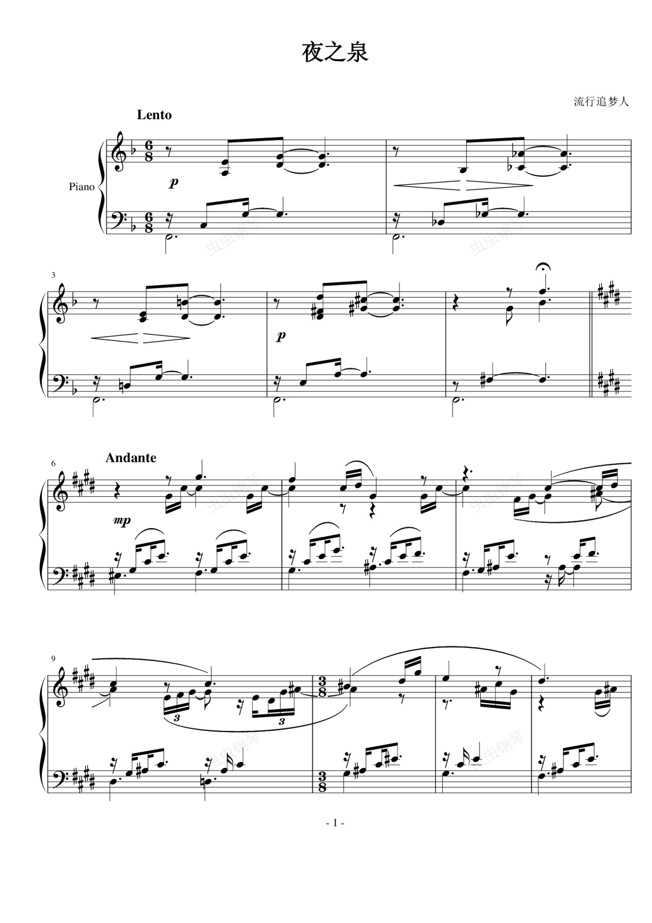 夜之泉,缓缓地淌过心灵的花园…… 有的地方音错了,改一下。 这首曲子是比较偏于浪漫派和印象派风格的,速度可以自由一点。