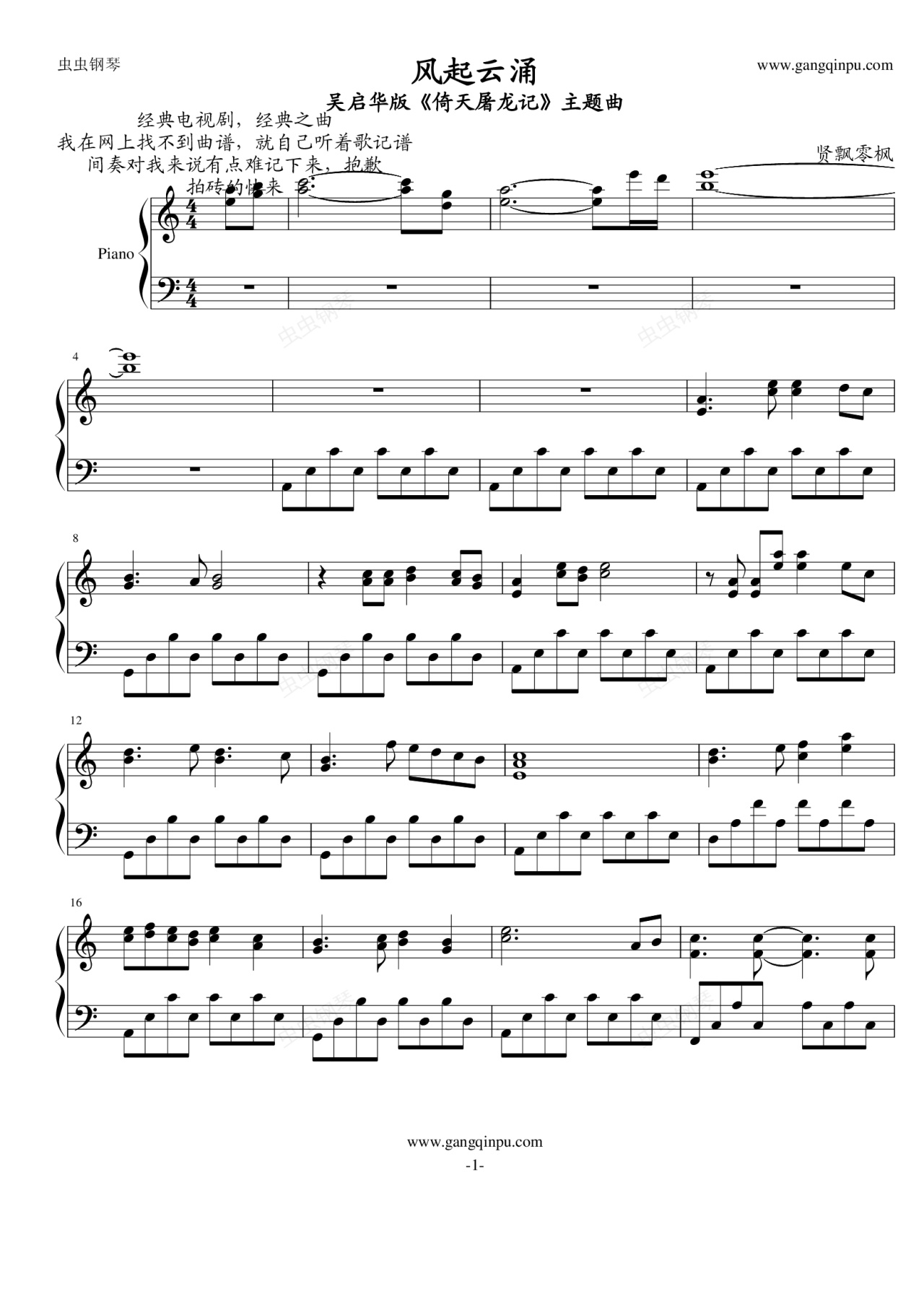 钢琴谱:风起云涌——吴启华版《倚天屠龙记》主题曲