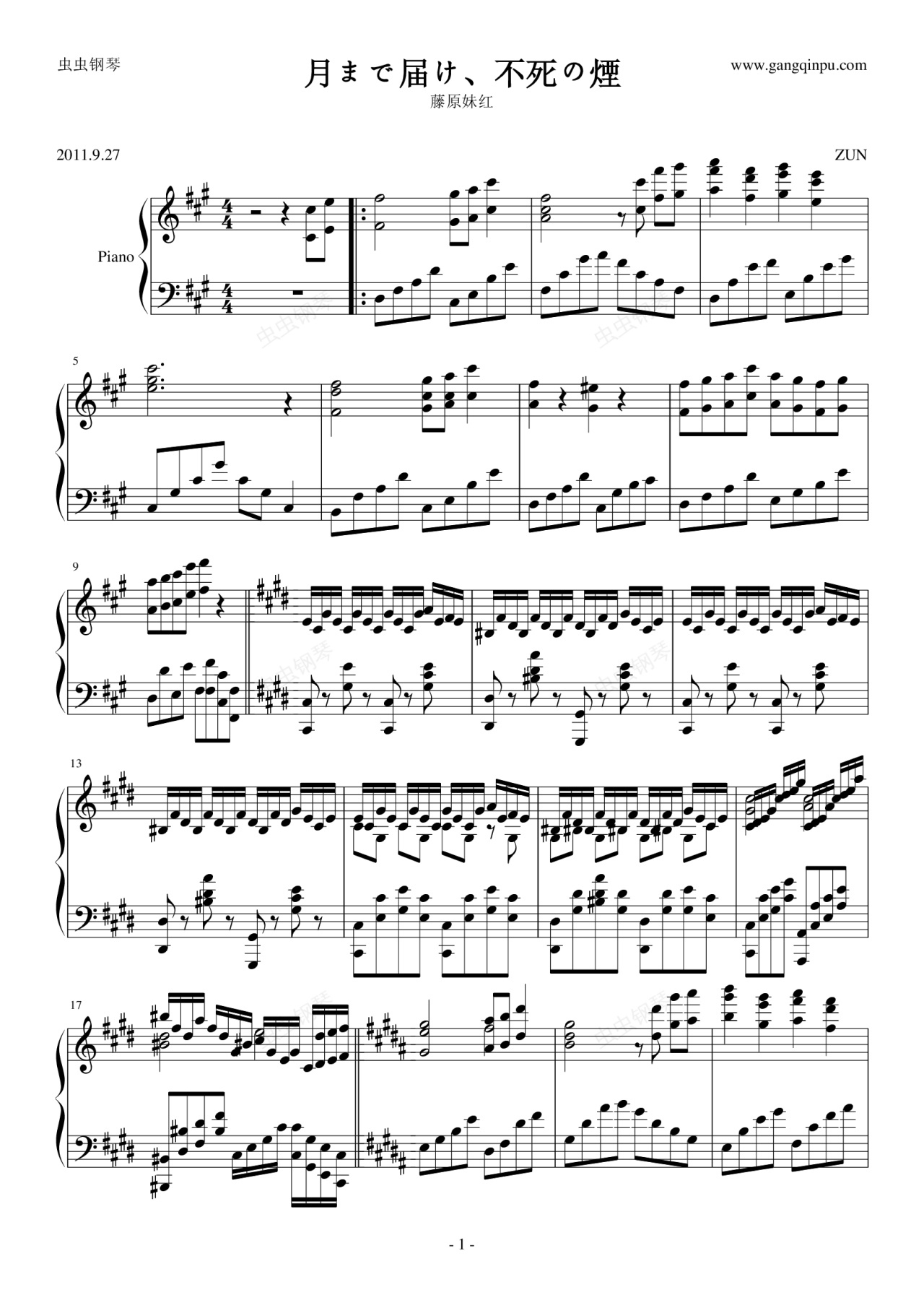 钢琴谱:【HARD】月まで届け、不死の煙(藤原妹红)