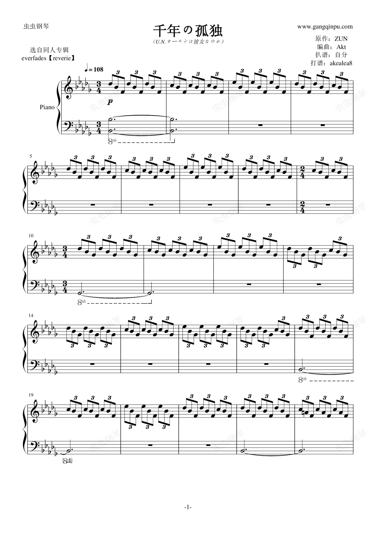 钢琴谱:【东方】千年の孤独(U.N.オーエンは彼女なのか)