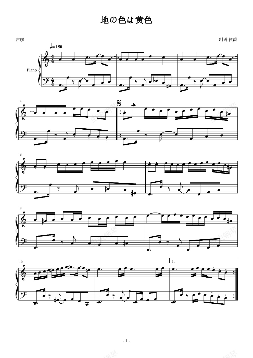 钢琴谱:【东方】~地の色は黄色