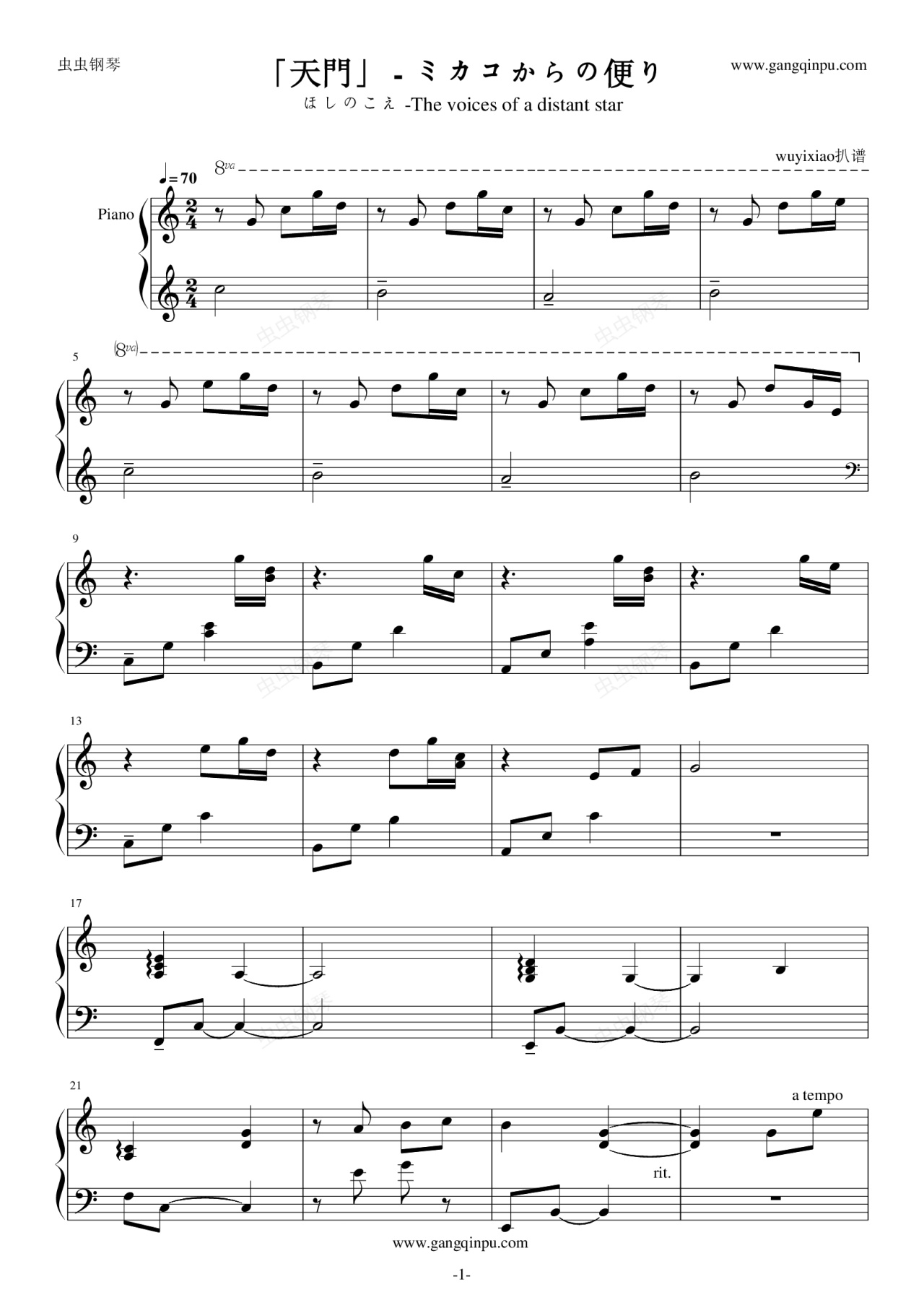 钢琴谱:「天門」ミカコからの便り (星之声)