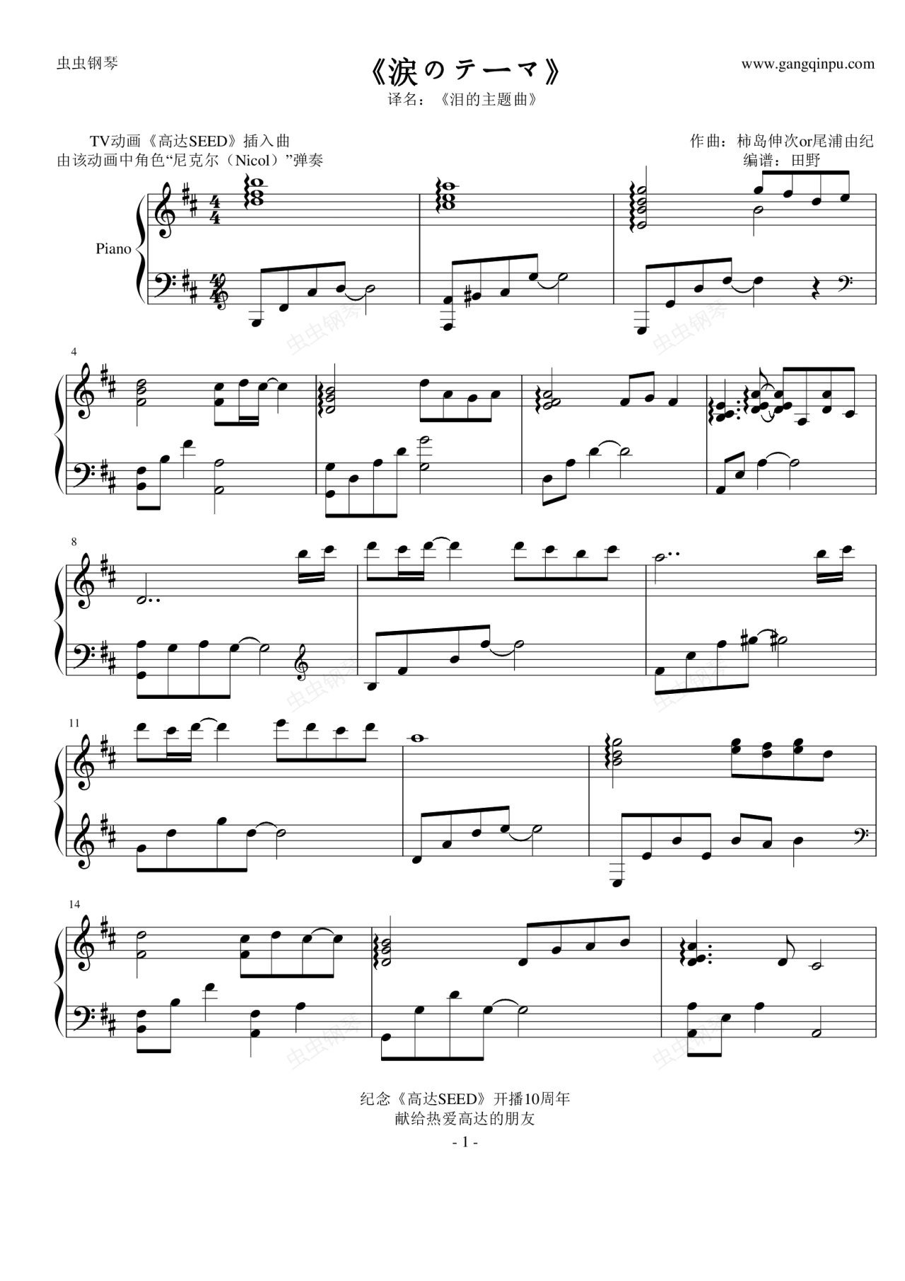 今年是TV动画《高达SEED》开播十周年,小编我有感而发根据原声扒了个《涙のテーマ》,其曲目原声采取了混响渲染,使得钢琴声有回音效果,及其难辨音,(到现在我还在嘀咕到底第4小节结尾那是几个音=。=)。希望童鞋们喜欢o(∩_∩)o