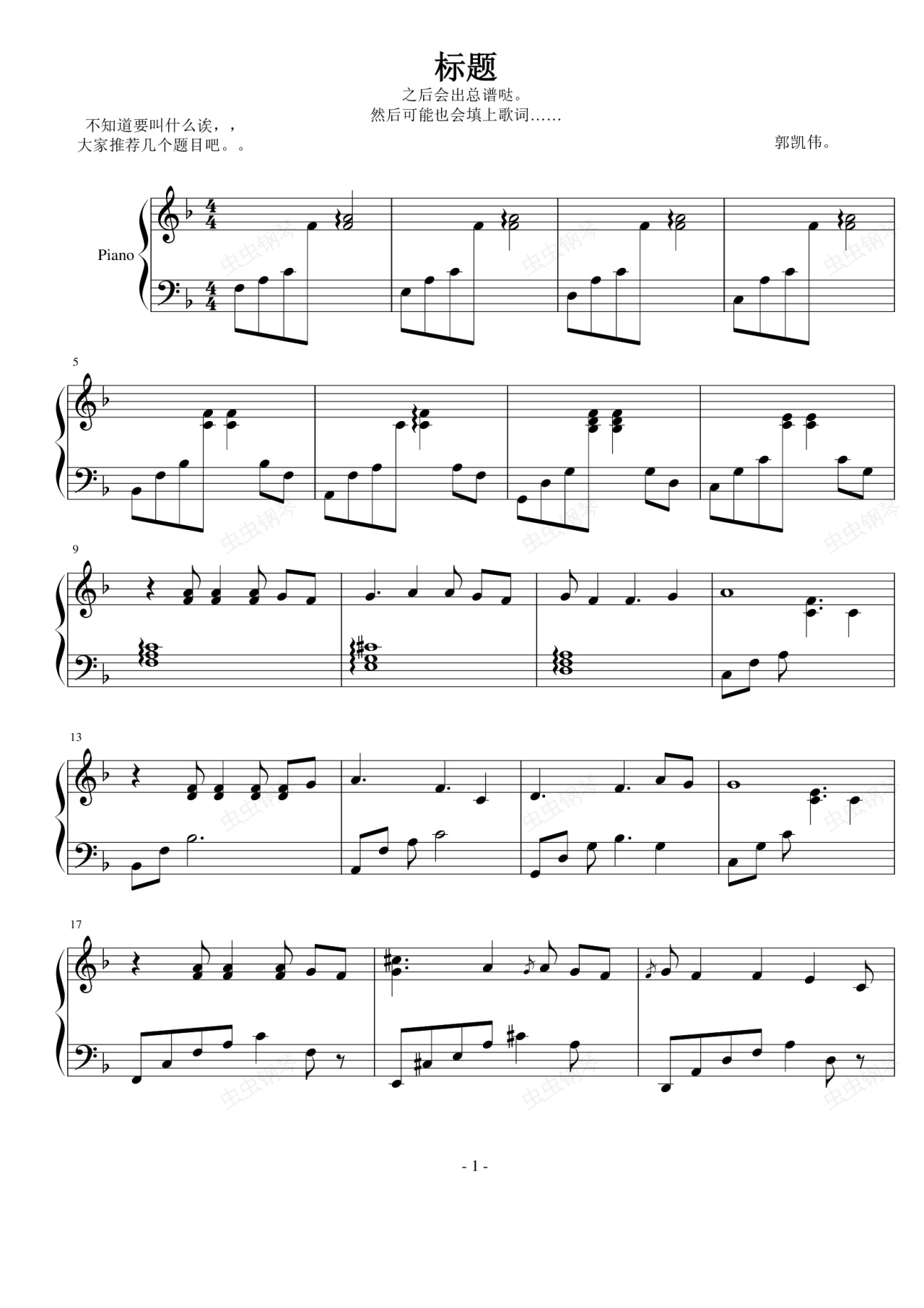 啊啊。传了三次的说,这是第四次了。。不知为什么前三次都没反应。。题目不知道起什么好诶,大家推荐几个嘛。后期可能还会出总谱哒,哈哈。大家一定要听到最后哦,最后的高潮比较好听,求支持啊!!!!