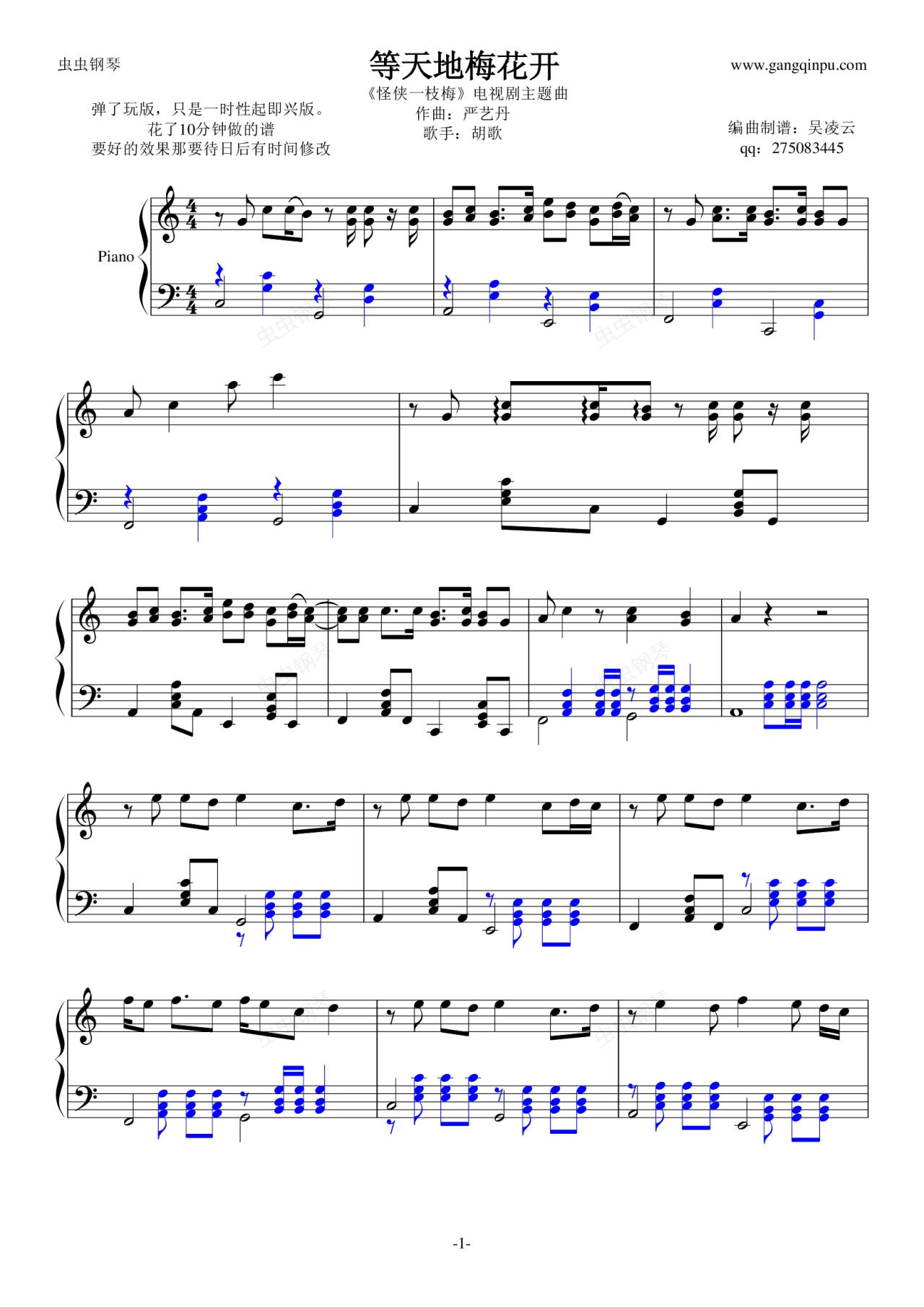 钢琴谱:等天地梅花开 怪侠一枝梅主题曲