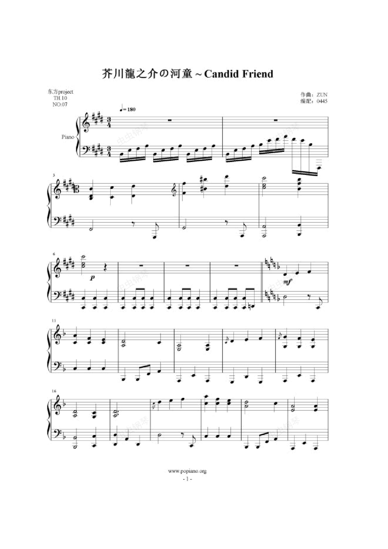 钢琴谱:【东方风神录】芥川龍之介の河童 ~ Candid Friend