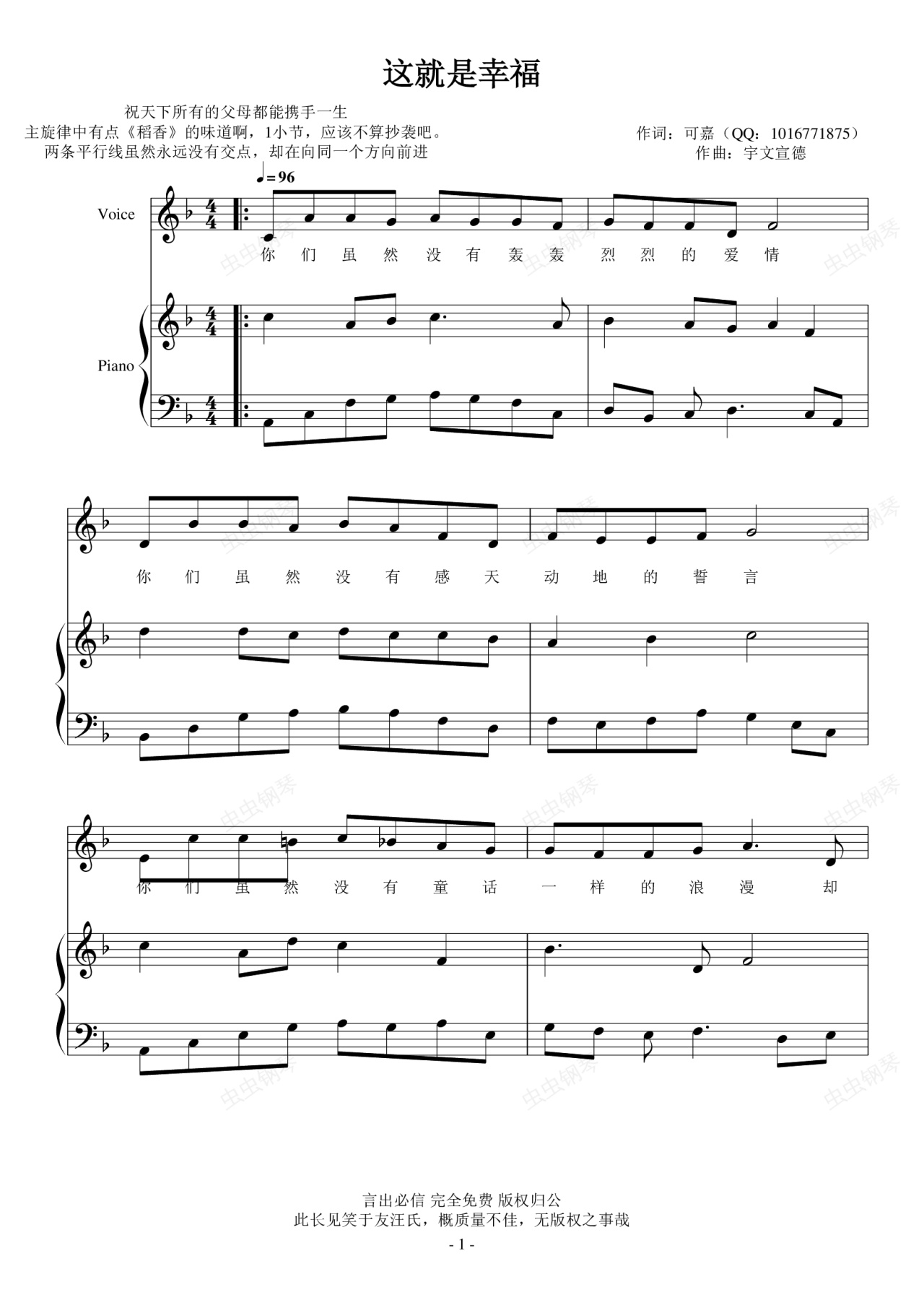 大概又要有朋友说我不认真了。的确,我承认,在写伴奏的时候一向抓耳挠腮,最后七拼八凑,索性就这样了。毕竟,一直以来我只是想写旋律,不想也不会写伴奏。可在人家钢琴网的领地上,总不能只放一个声部上去,太不给面子了吧。所以,还是如同挤牙膏一样地硬挤出两行又臭又长的。     现在的人,都说自己忙。有人是真忙,有人是瞎忙。我大概属于后者吧,但时间不多,这倒是真的。这些曲子和这段话都是在接近12点时写的,闲话少说,理解万岁。     这次作词的朋友是残疾人,他希望为他父母在他们即将到来的结婚20周年纪念日上送一份特殊的礼物。悯其人而感其孝,故优先完成他的,在此,祝愿他的父母幸福到老,也希望他能永远快乐。     近来也颇为不顺。真的辞职以后就要一心复习读书了,无限期暂停接受任何作曲的请求,望大家谅解。