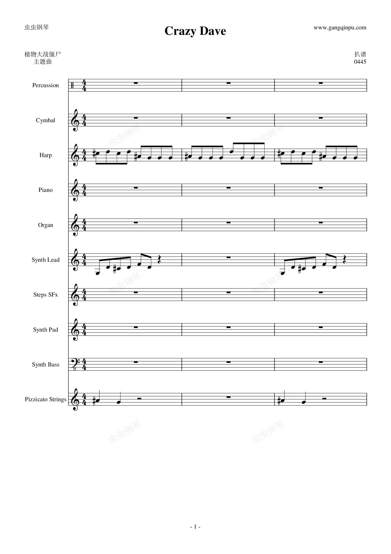钢琴谱:植物大战僵尸-主菜单[Crazy Dave]【总谱】