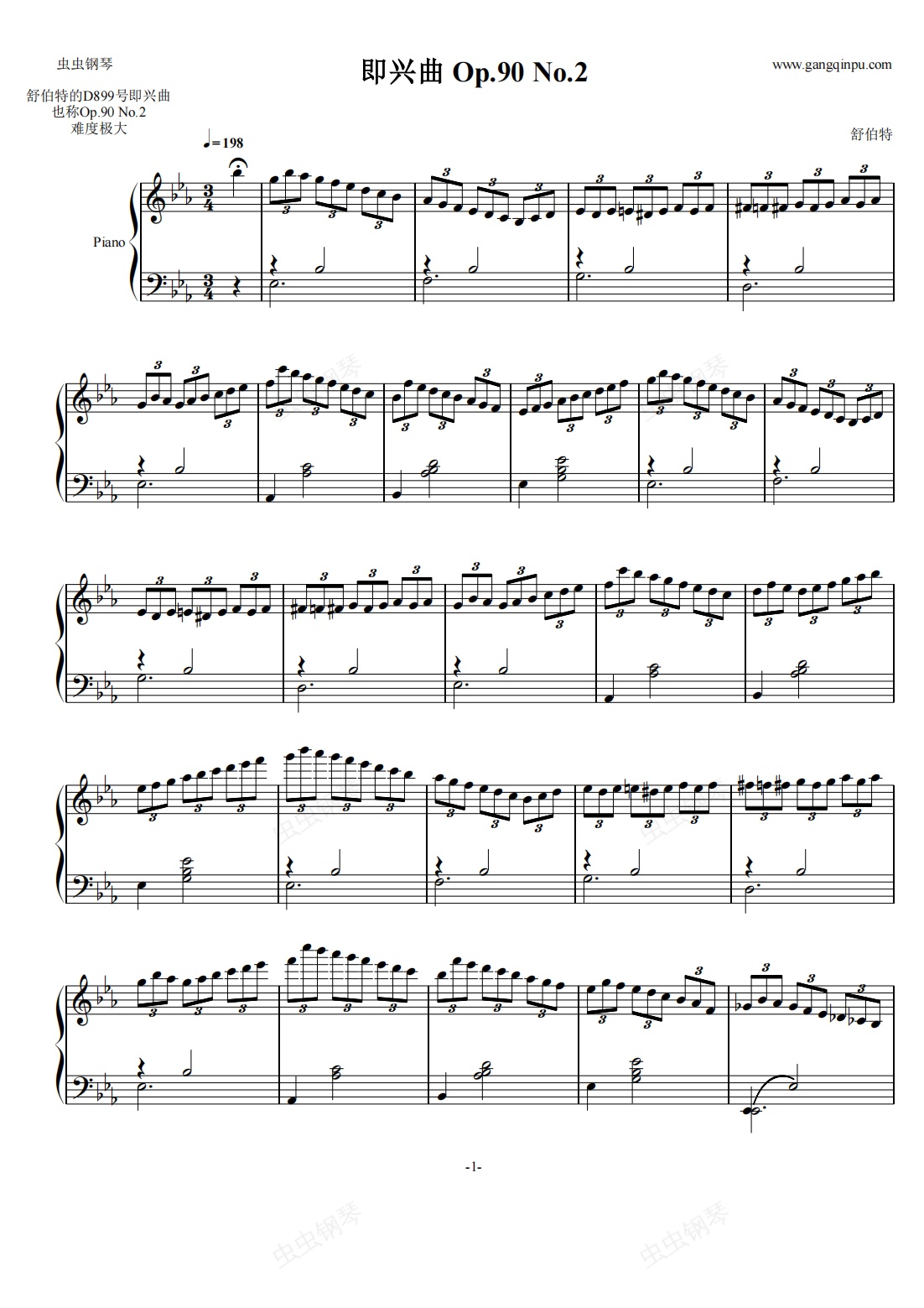这一首曲子来自于舒伯特D899号即兴曲的第二首,降E大调,三段体,一开头,一连串的三连音便如一股溪流不停地奔泻而出,沁人心脾,想象一下,这段音乐来配什么画面最合适?当然是林中的小溪欢快的奔腾,蝴蝶的漫舞,草长莺飞,中间陡然一变,钢琴奏响了一支乡间舞曲,风格优雅欢快,恰如溪边的野花在微风吹拂下翩翩起舞,一派生机勃勃的田园风味。这支即兴曲最富画意,能活生生地把听众带到田野小溪边去。无形的声音几乎要化为有形有色的画,扑面而来!