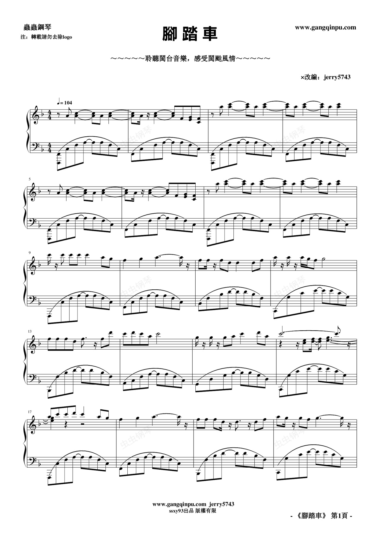 钢琴谱:腳踏車 (南國清新情調)