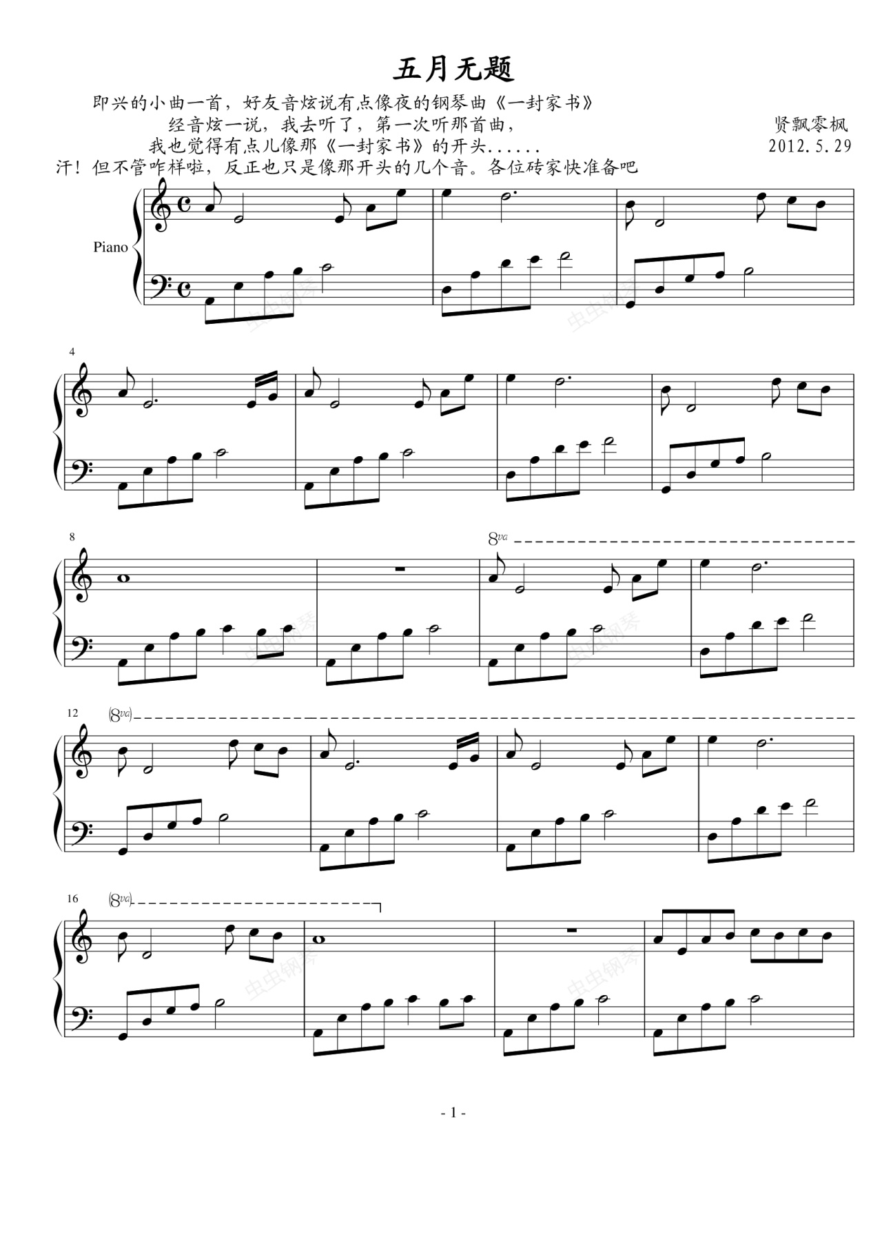 钢琴谱:五月无题——贤飘零枫