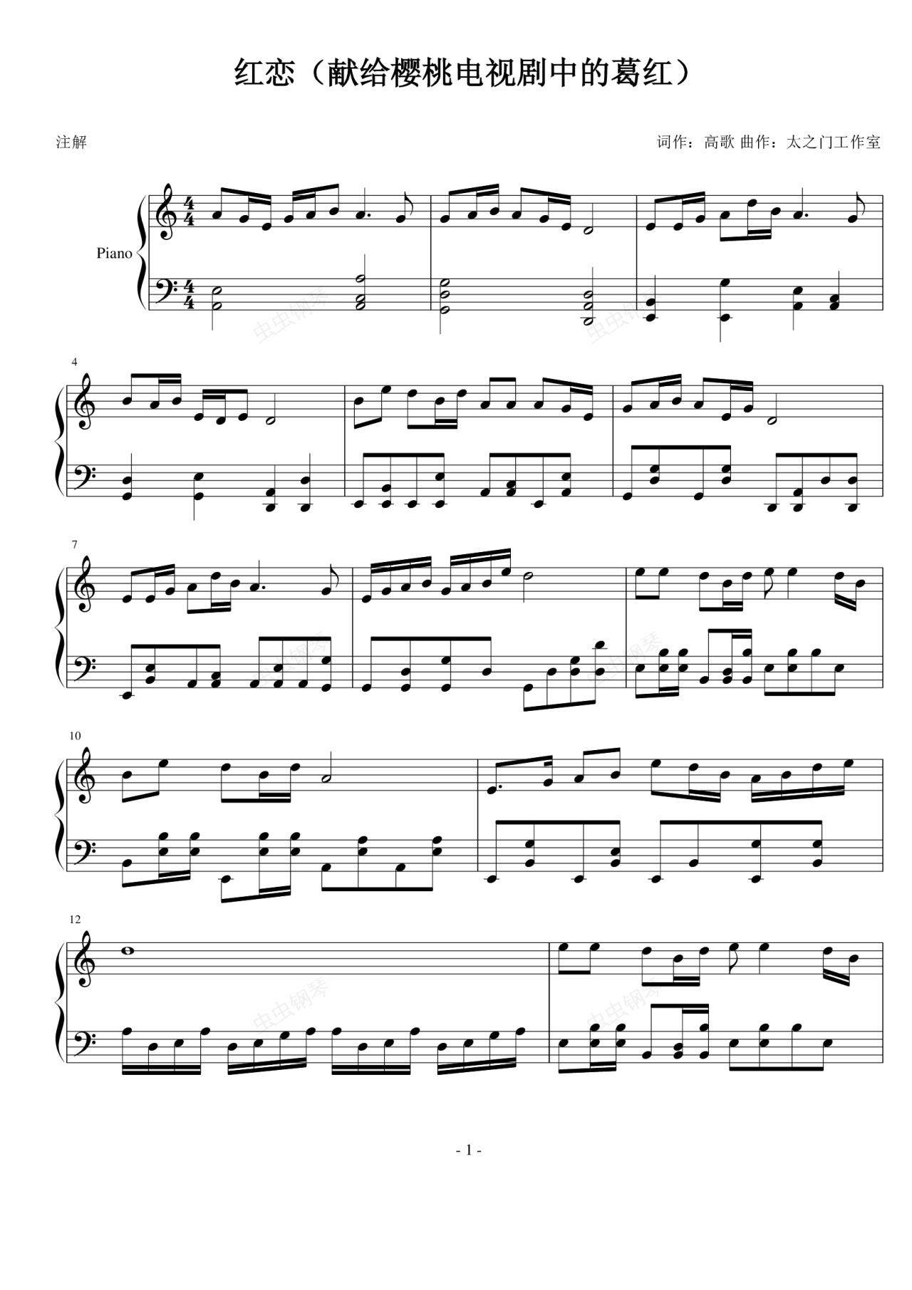 钢琴谱:红恋(献给樱桃电视剧中的葛红)