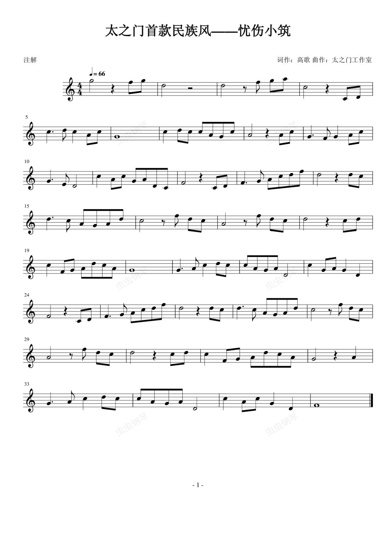 钢琴谱:太之门首款民族风——忧伤小筑