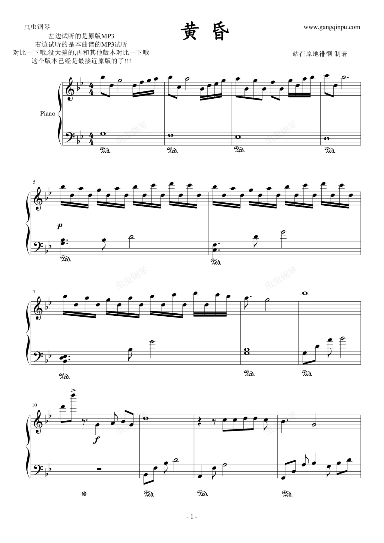 突然听见钢琴版的黄昏(原唱的实在受不了...)一时兴起早上六点半起床做到中午一点。。然后下去去完学校闭学式晚上继续努力。。终于做完了,这个谱子是我第一次这么用心的去做哦,每一个小节我都努力地做到完美,但是也许还是会有一些缺漏吧。音效不怎么会做诶,不过至少能保证谱子里面的错误比较少啦,大家参考参考啦,演奏的时候左手轻一点哦,然后有些地方可能会稍微难了些,自己可以根据自己的水平修改的。唉,毕竟我水平有限啦,若有不足之处各位高手尽管指出昂!嘿嘿。