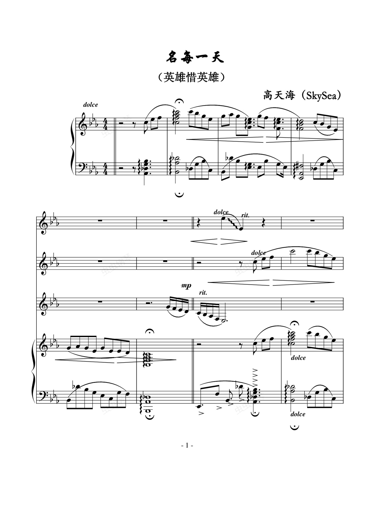 北雪南雨原手稿(赠每一天),高天海()在深夜里把原手稿和MP3制作出来之后,第二天傍晚发给了我时,他在电子邮箱里说,谱面任何一个符号和点都要保留,就要它原来的味道。这首歌曲是他先创作了歌词,词的形式是唐宋词辞,再用整个词的意境,提取境界创作曲子。词名为《英雄惜英雄》,曲名为《名每一天》。他说原先是想要我直接联系每一天老师,把原稿发给老师的。但因为,他不善言辞和阐述,沟通的不便。(但在我眼里,是一个惜字如金的人,他很会写、创作,空话少,做事很认真,一直都是)。他用了北雪和南雨来象征他心里没有对大家要说出来的话,我也知道自己不应该问。他只说了,在他的音乐里曾有一位不曾相识的女孩对他的一首歌说过:世界上若有真正的南与北之分,那么北世界的人听了会下雪,南世界的人听了会下雨。他说,真正用心去听懂了高山流水的人和看明谱的人,才能学会体会心的境界。我就知道有着保留的作风。最后,高天海原话说:北雪南雨,英雄惜英雄,音乐无人界,我的音乐九度双手并拢,低头沉默坚定!我创造能够操了我的音乐艺术。我把这首高天海式古代唐宋歌曲风原稿个人的音乐想法赠与每一天老师,同时也是赠与一直默默支持我的人。他说要我们虚心去学习西洋音乐和交流合作的同时,要记住我们是中国人!用心告诉外国人,中国人有着五千年的音乐文化,我们有着强大的音乐生命力,需要我们去发掘它。