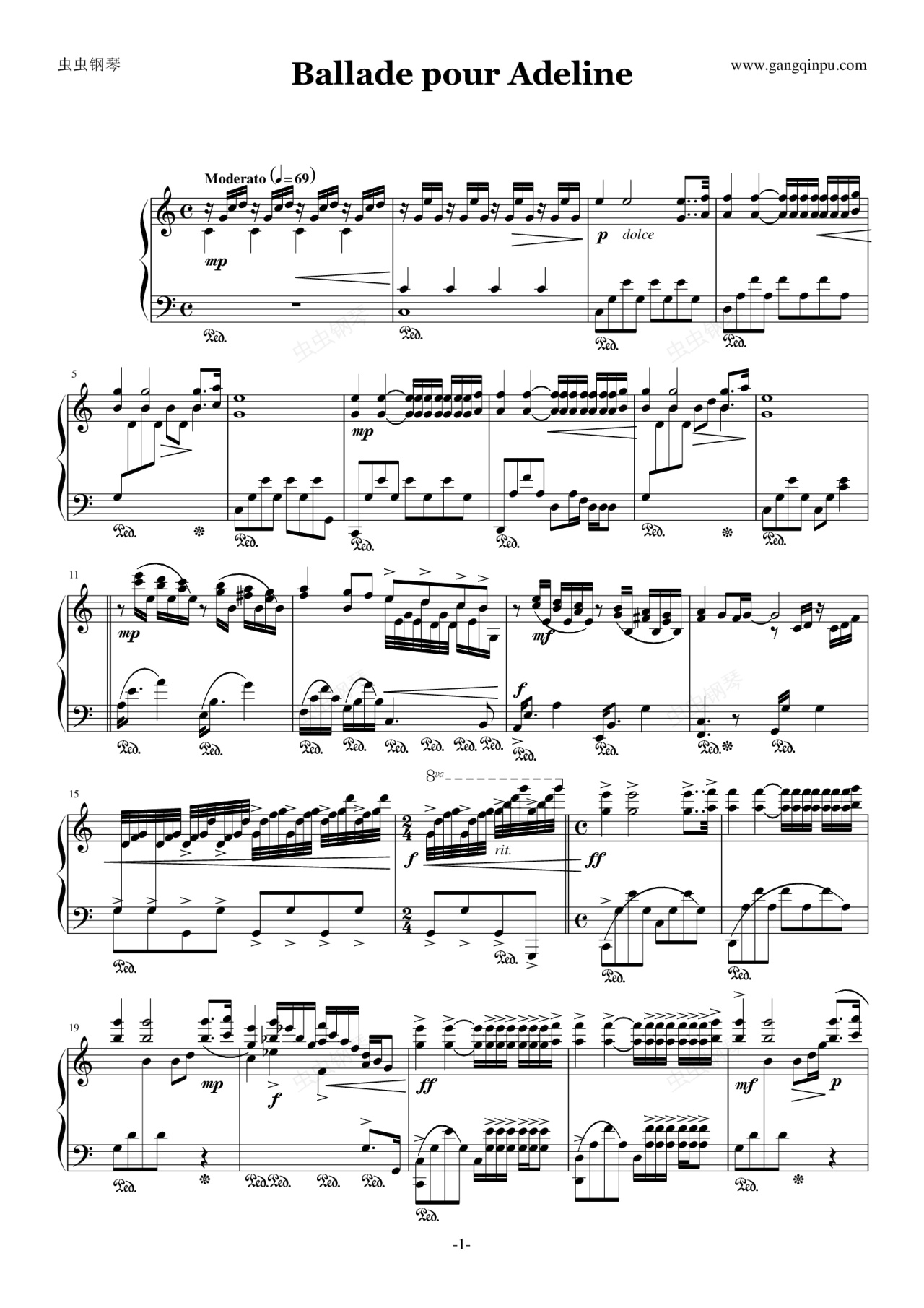 钢琴谱:致爱德琳诗(水边的阿狄丽娜)