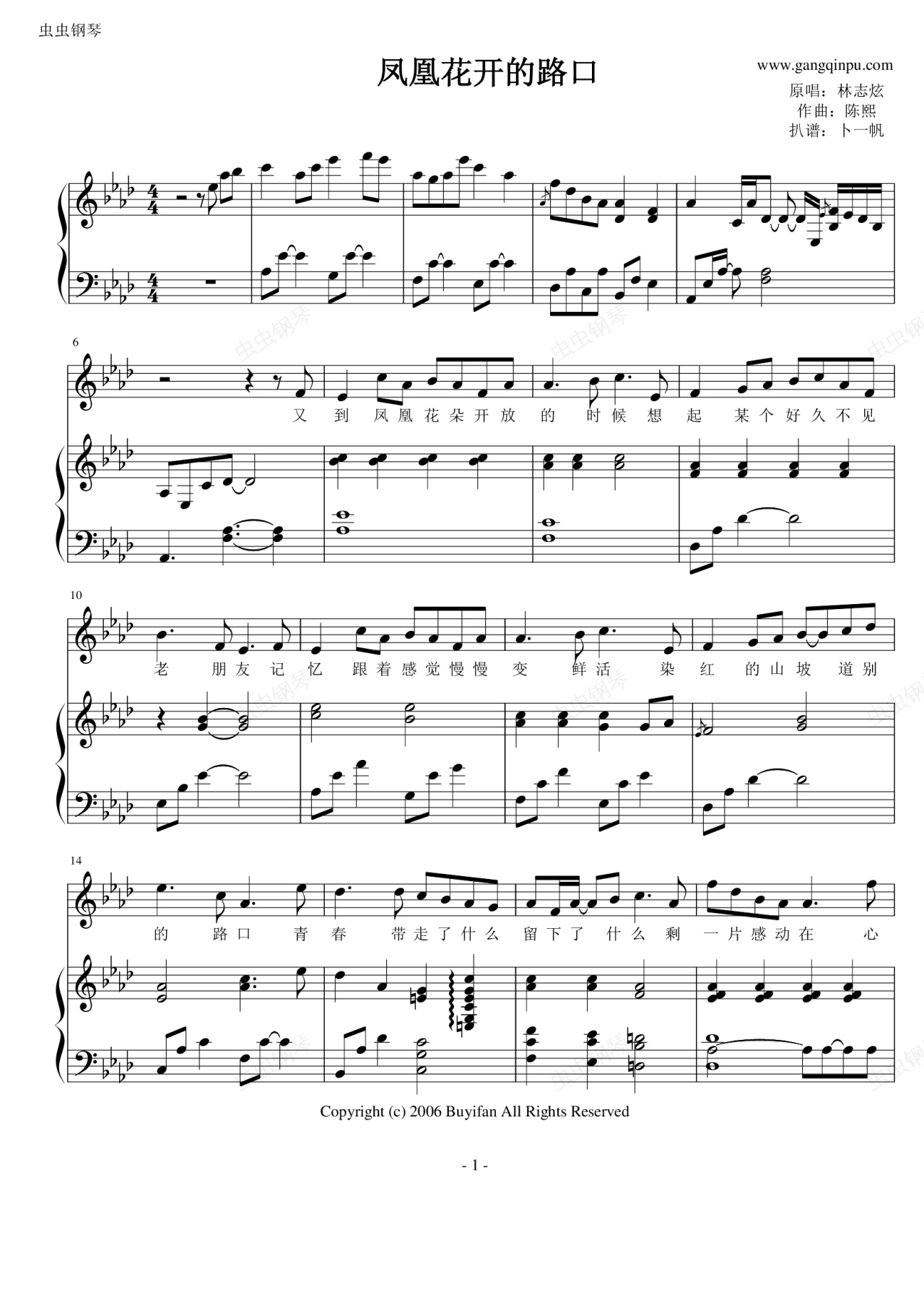 钢琴谱:凤凰花开的路口