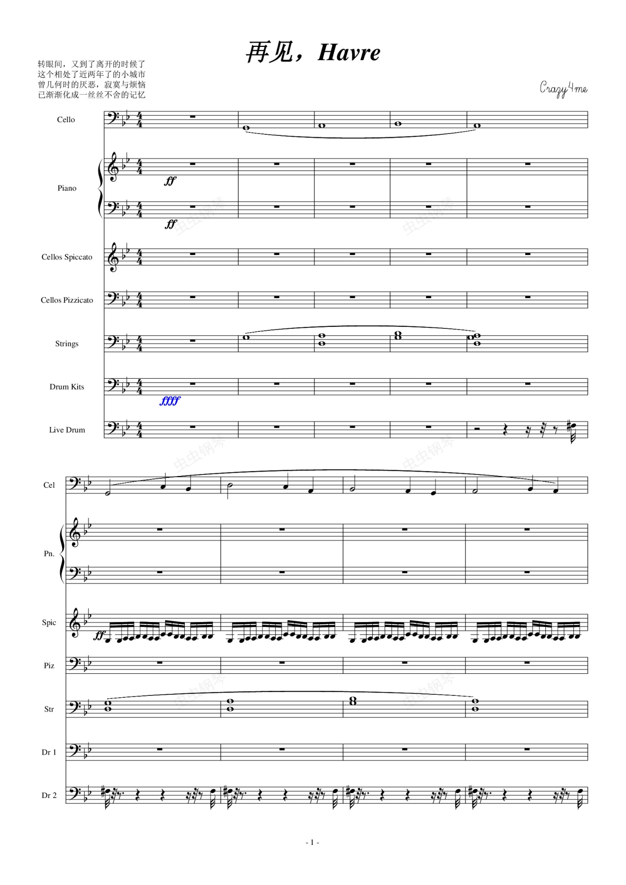 钢琴谱:再见,Havre(钢琴&大提琴)