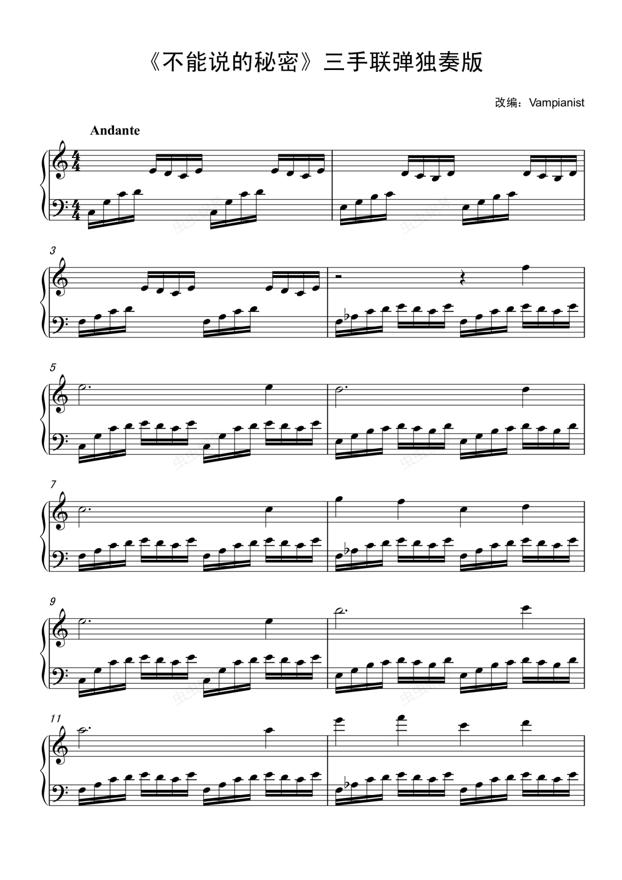钢琴谱:《不能说的秘密》三手联弹 独奏改编