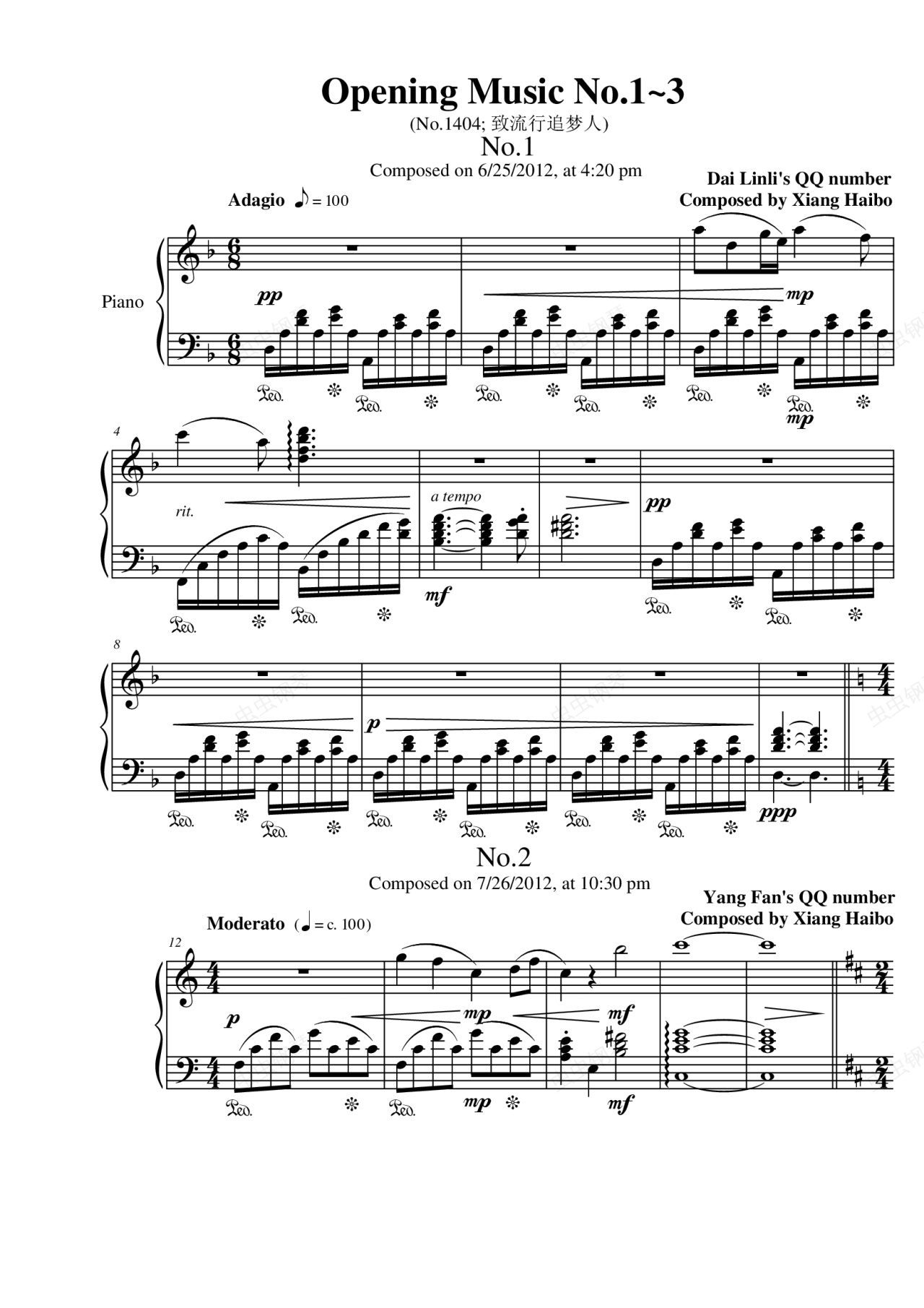 钢琴谱:Opening Music No.1~3: 致流行追梦人
