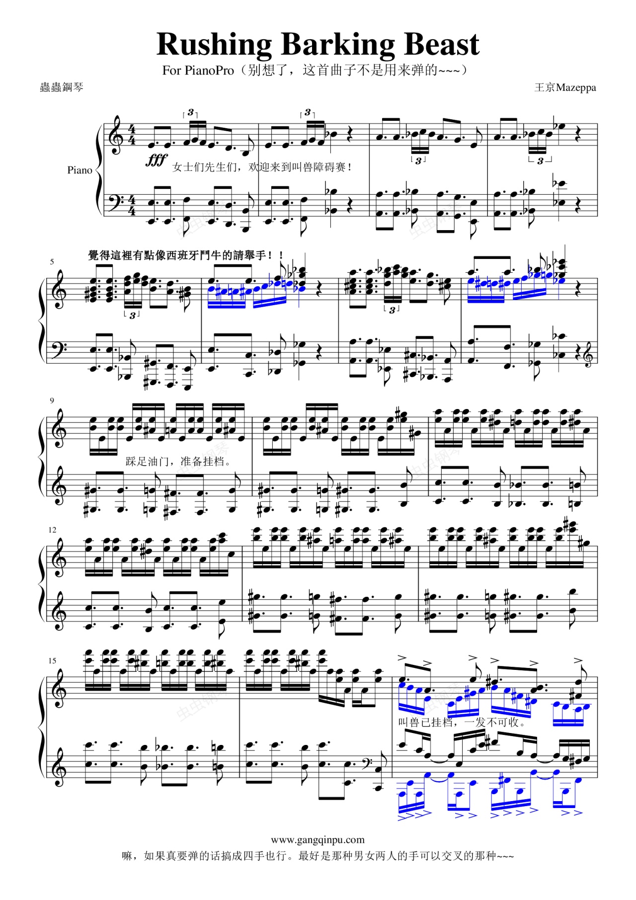 嘛~嘛~,之前说过了要送叫兽一首曲子,于是咯。。。其实没什么说的啦,淫笑做得很辛苦啦,打谱倒也没什么,这首曲子一个人是肯定弹不下来的啦,最好是情侣,男的弹低音谱表的低声部和高音谱表的高声部,女的弹剩下的。。。嘛,要是声部之间音有重复的话,没办法,双钢琴吧,也不是我要把各位情侣拆散的。。。要说动机的话,之前听了叫兽的光棍组曲,送首东西祝福一下咯,没那么肉麻的啦,也祝兽夫人赶快出世吧。。。啊,还有一点,之前总觉得自己的东西都是偏古典的咯,这次来点现代的。。。如果觉得不像,还请多多拍砖。@流行追梦人。。。