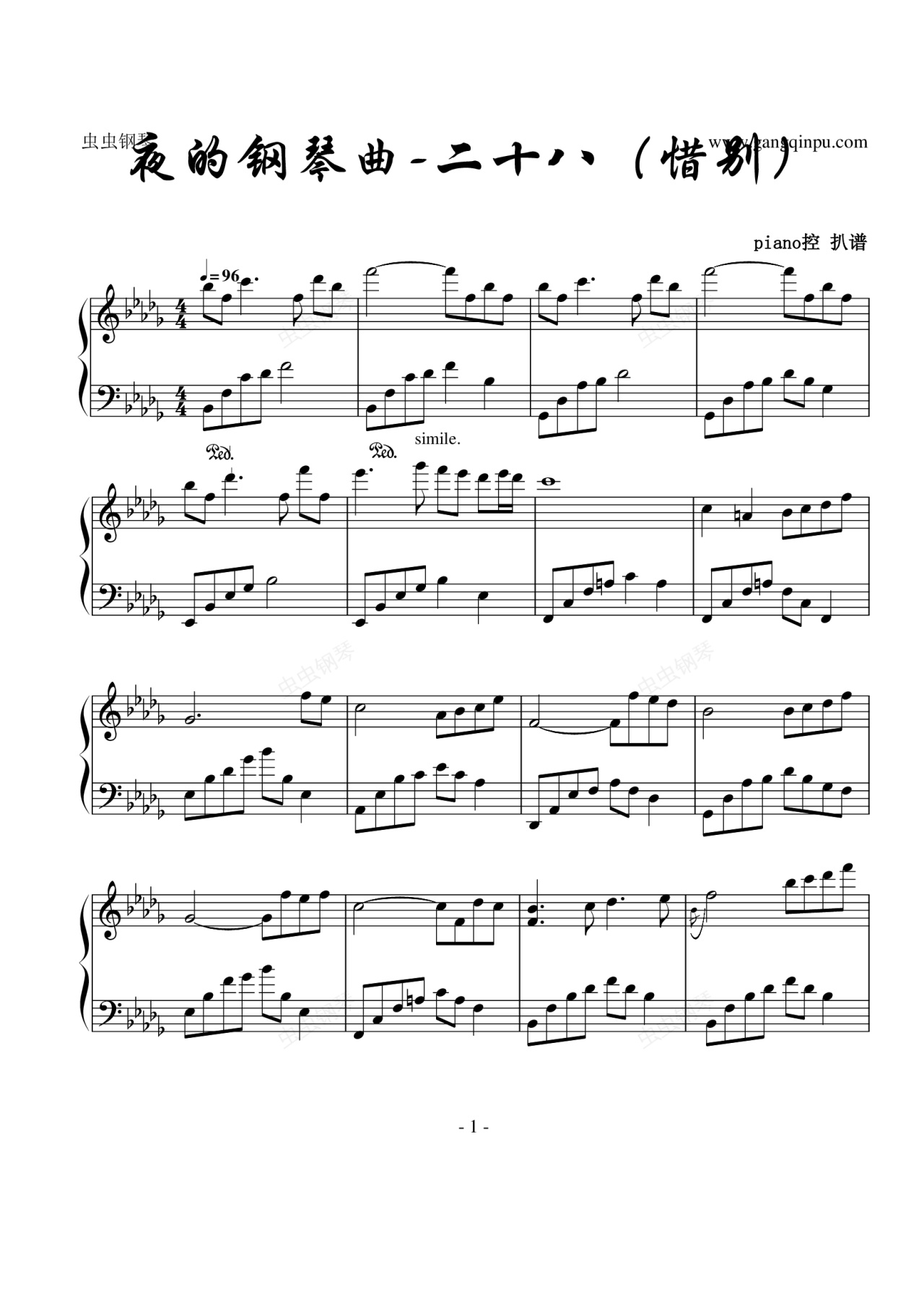 钢琴谱:夜的钢琴曲二十八(惜别)降D调