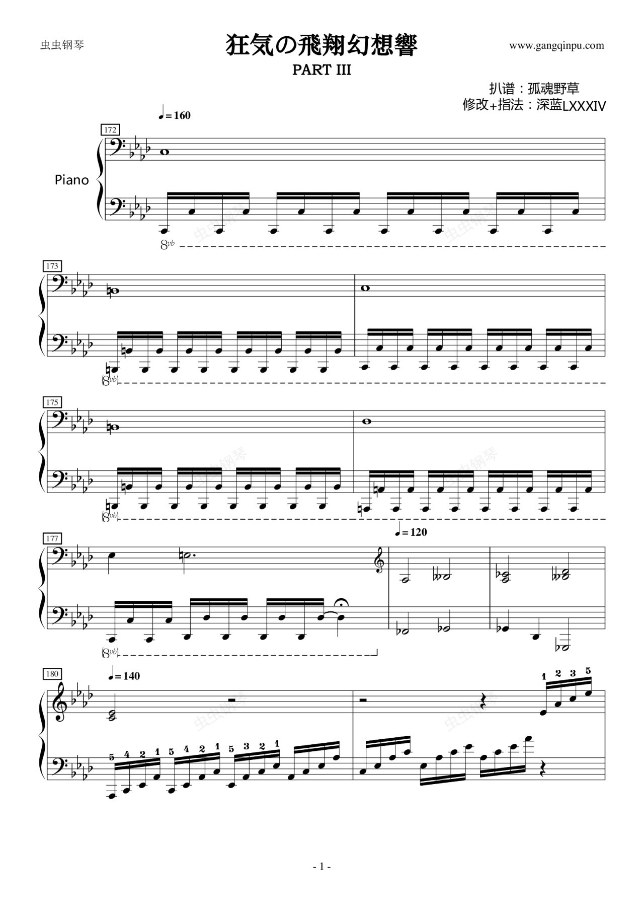 很多16分音符琶音如第180,186小节等等,该谱只是标出了单手弹的指法,也可以按照D猫殿下视频中那样,四个一组,左手弹根音,右手弹剩下三个音。第240小节在弹完两个黑键后个人推荐用刮奏,也可以按照D猫殿下视频中那样用音阶的弹法。第241小节当中的Mi可以用左手大拇指弹也可以用右手大拇指弹。