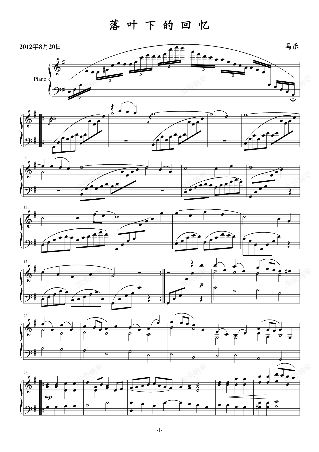 钢琴谱:落叶下的回忆
