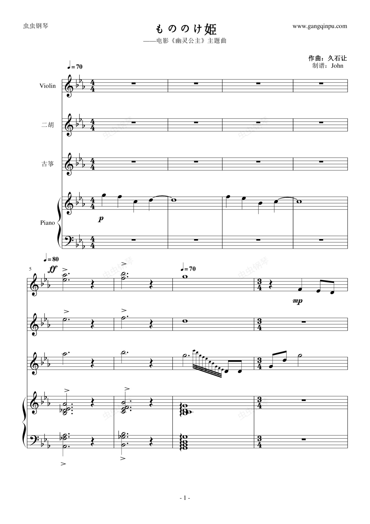 钢琴谱:幽灵公主合奏版总谱(二胡、古筝、小提琴、钢琴)