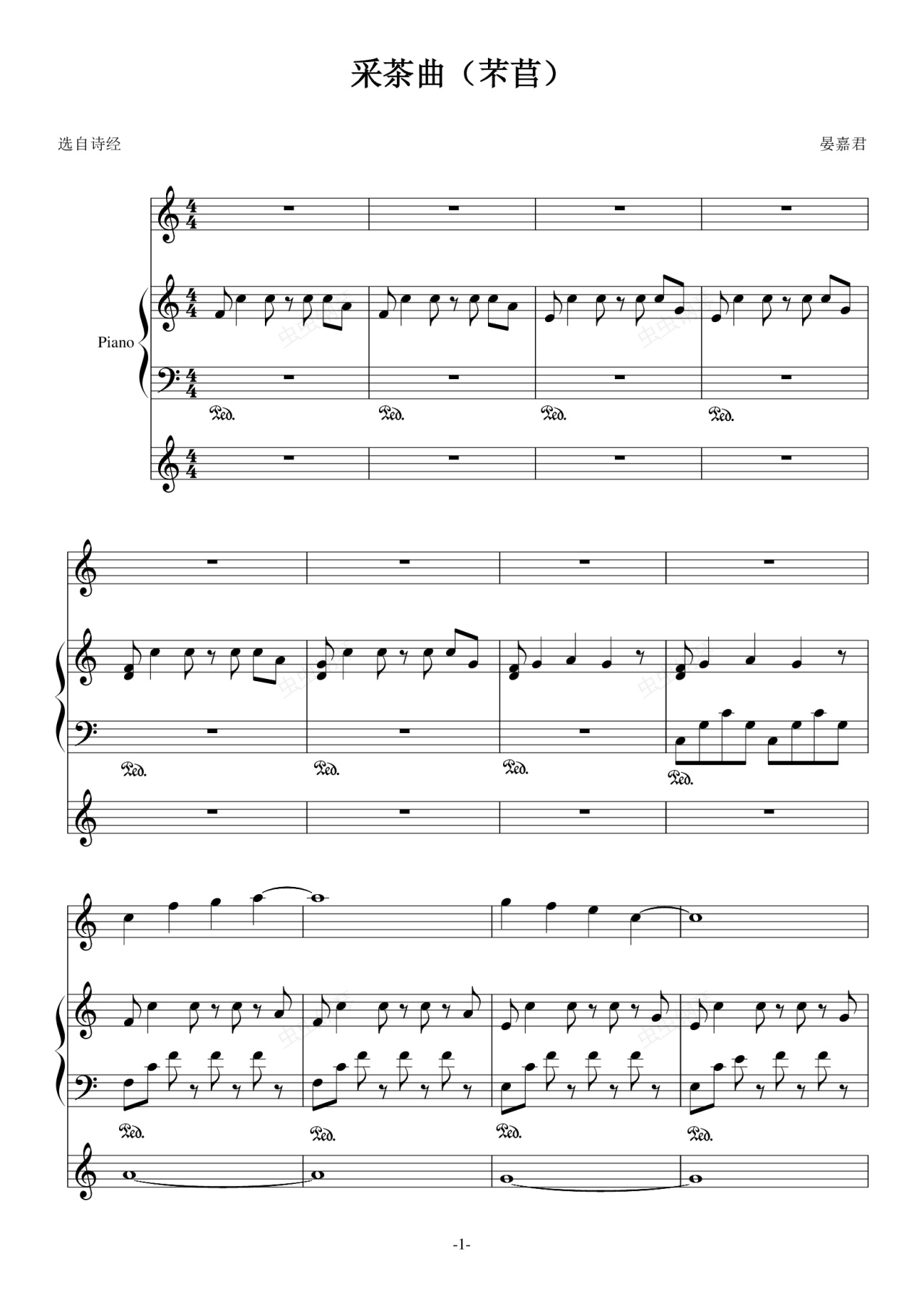 这首曲子是在高三第一次语文统练后写的,统练考到了诗经中的一首诗,名叫芣苢。芣苢其实就是车前草,先秦的妇女们采集它做草药。这首诗比较单调,被班里的同学鄙视了(其实是有点)。。。语文老师听后无奈地说,哎,你们21世纪的少年怎么理解得了先秦的妇女呢?在听了这话之后,我就写了这个曲子,其实也可以算是给芣苢的配乐吧,也许也有些单调,但我有尽力的感悟她们当时的生活状态啊:)21世纪的少年想认真地理解先秦的妇女~