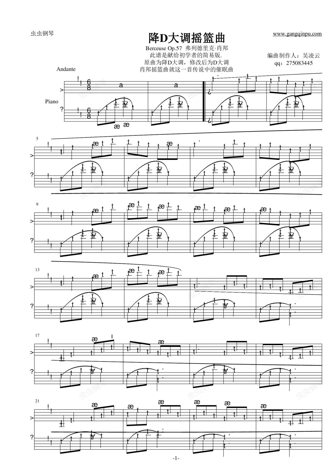 钢琴谱:肖邦降D大调摇篮曲简易版(育婴师必备)