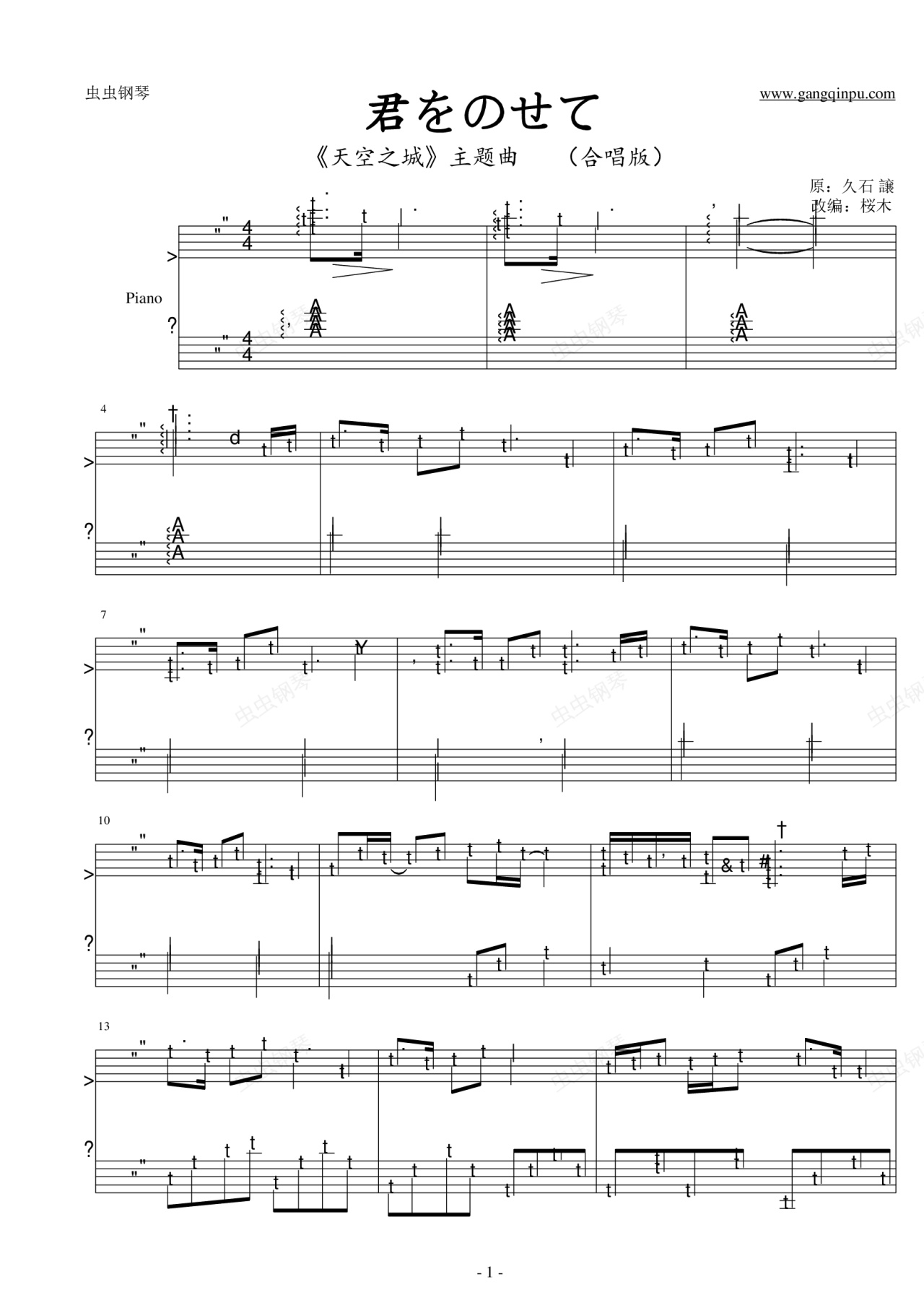 钢琴谱:君をのせて 天空之城(合唱版)