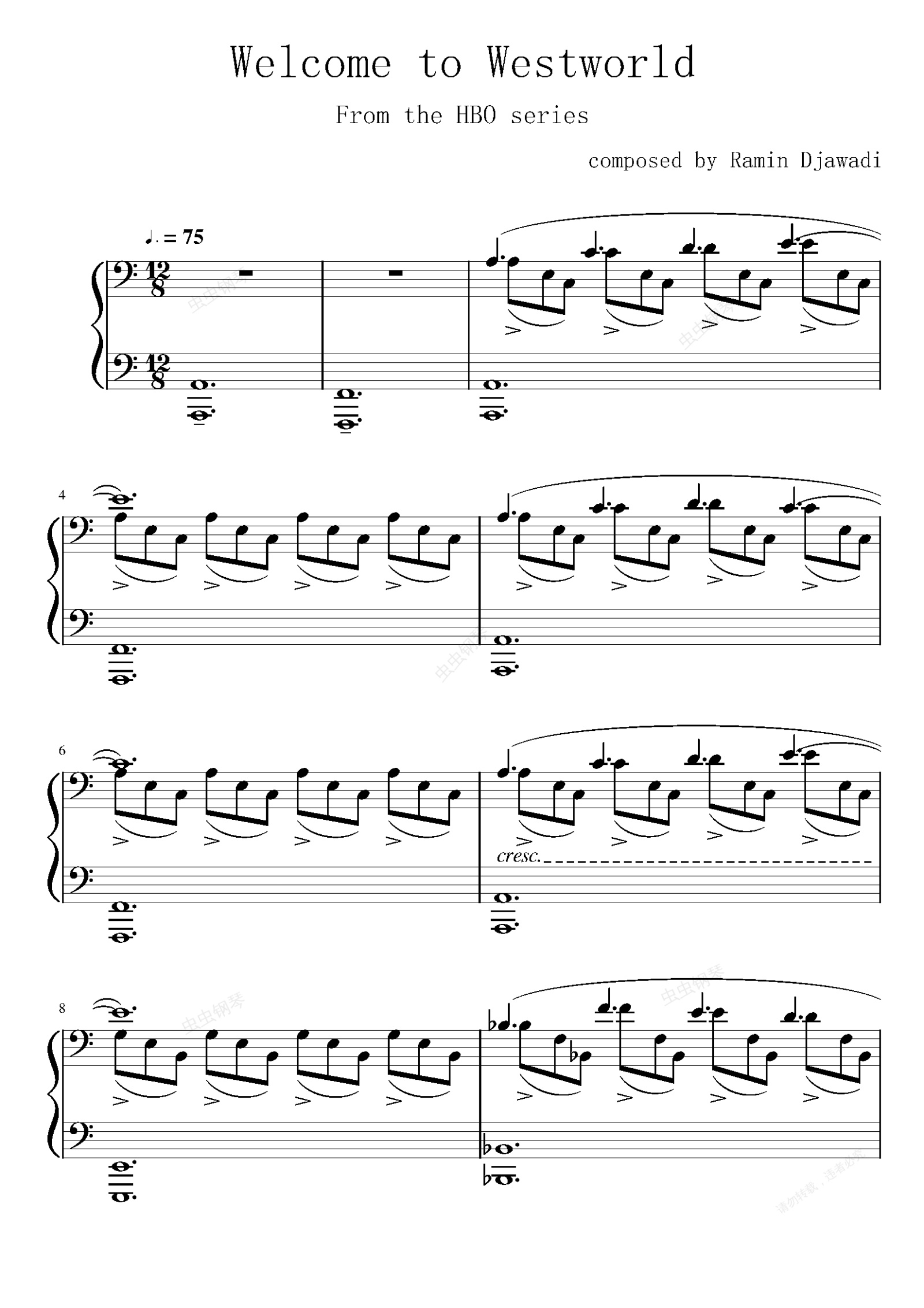 钢琴谱:《西部世界》主题曲——Welcome to Westworld