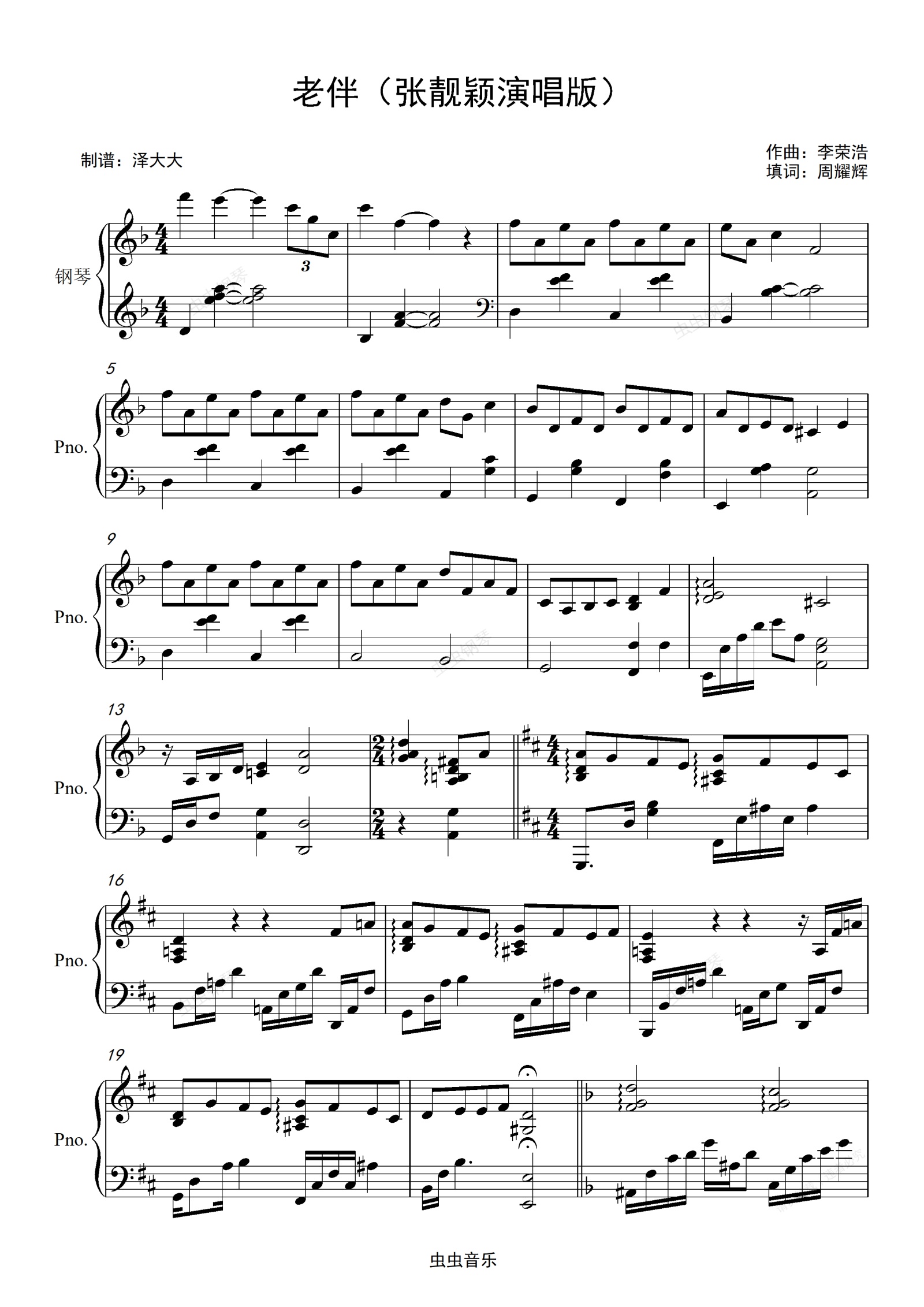 钢琴谱:老伴(张靓颖版)