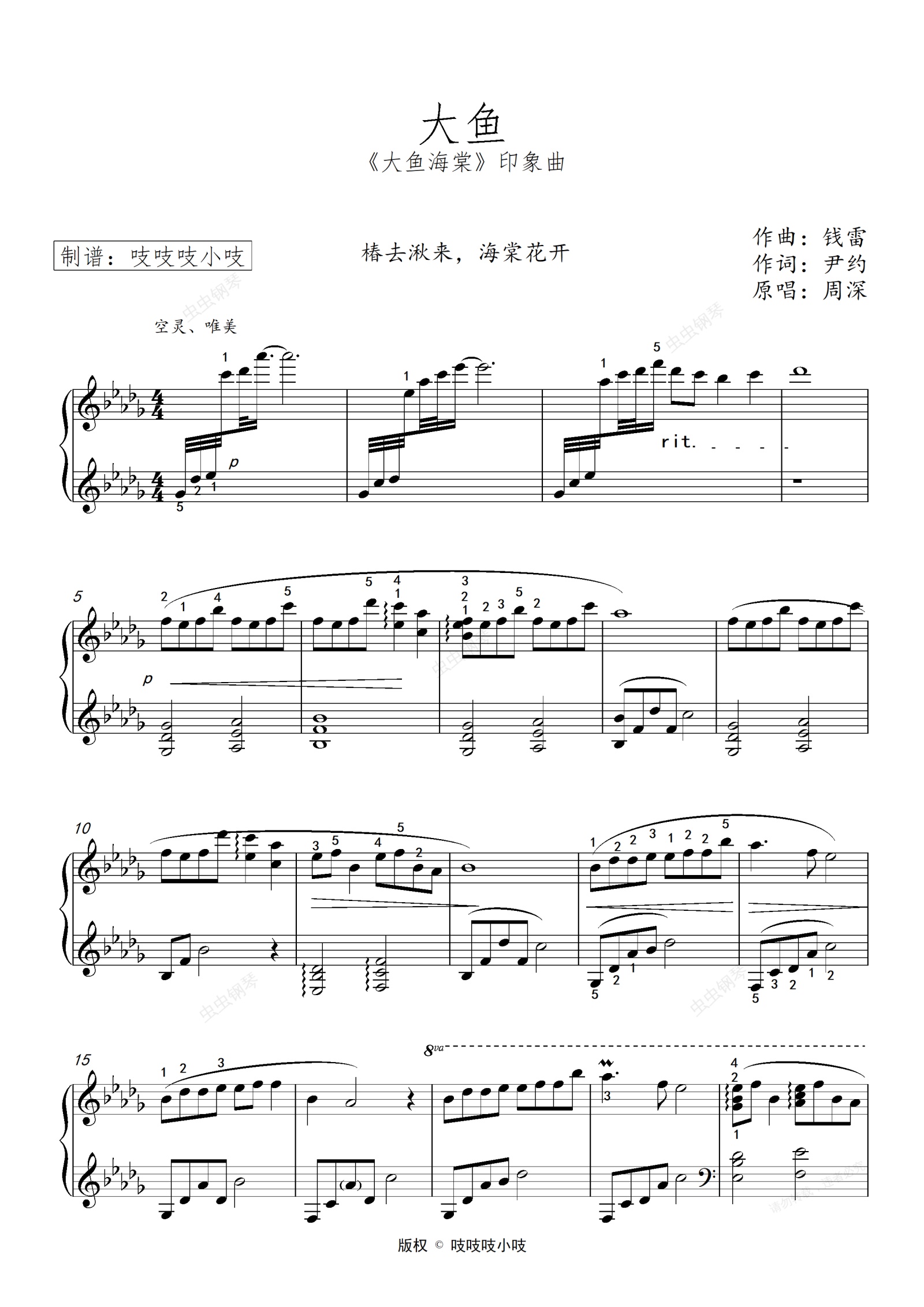 钢琴谱:大鱼——(《大鱼海棠》带指法钢琴独奏)
