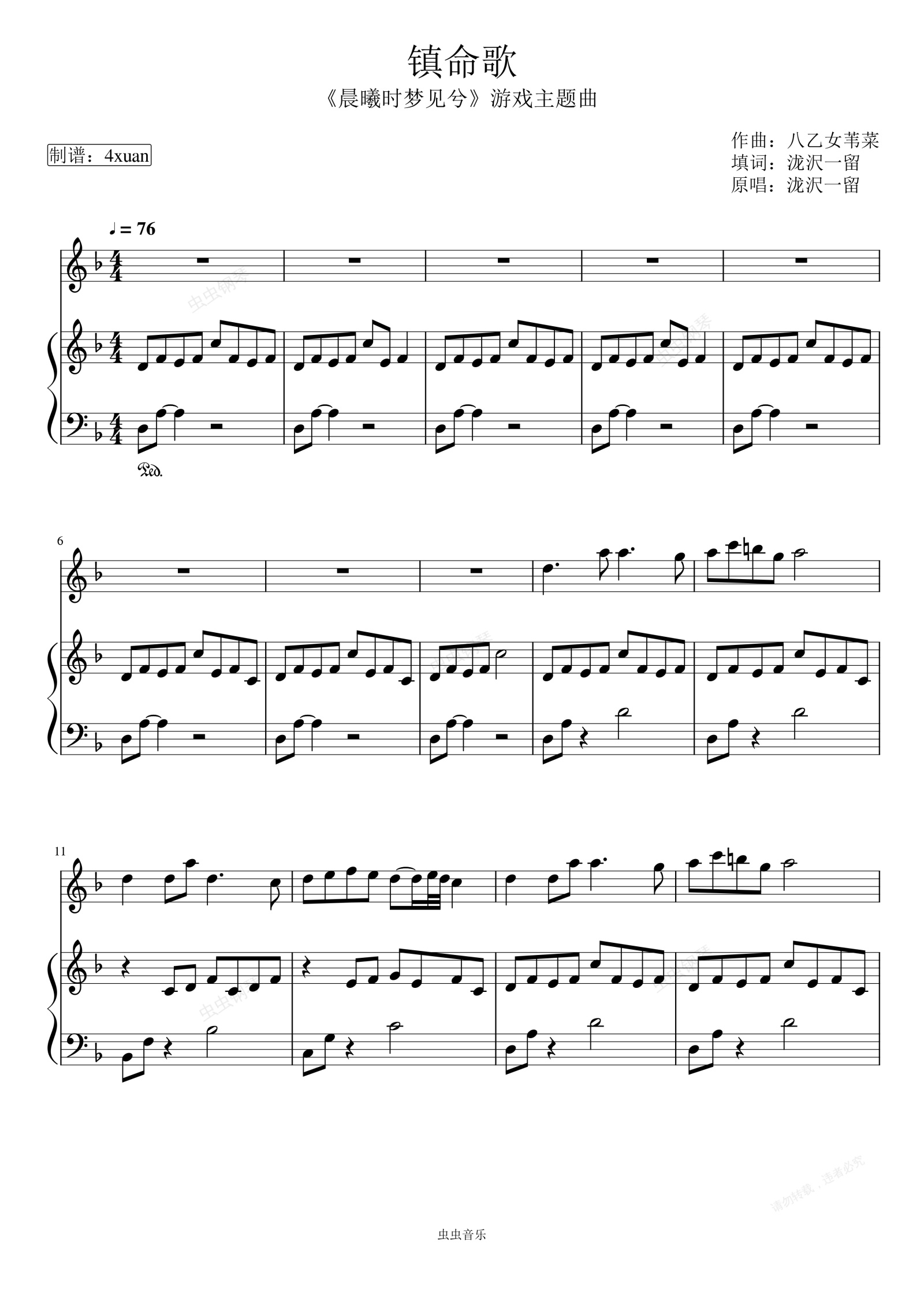 钢琴谱:镇命歌--日本乙女游戏《晨曦时梦见兮》主题曲