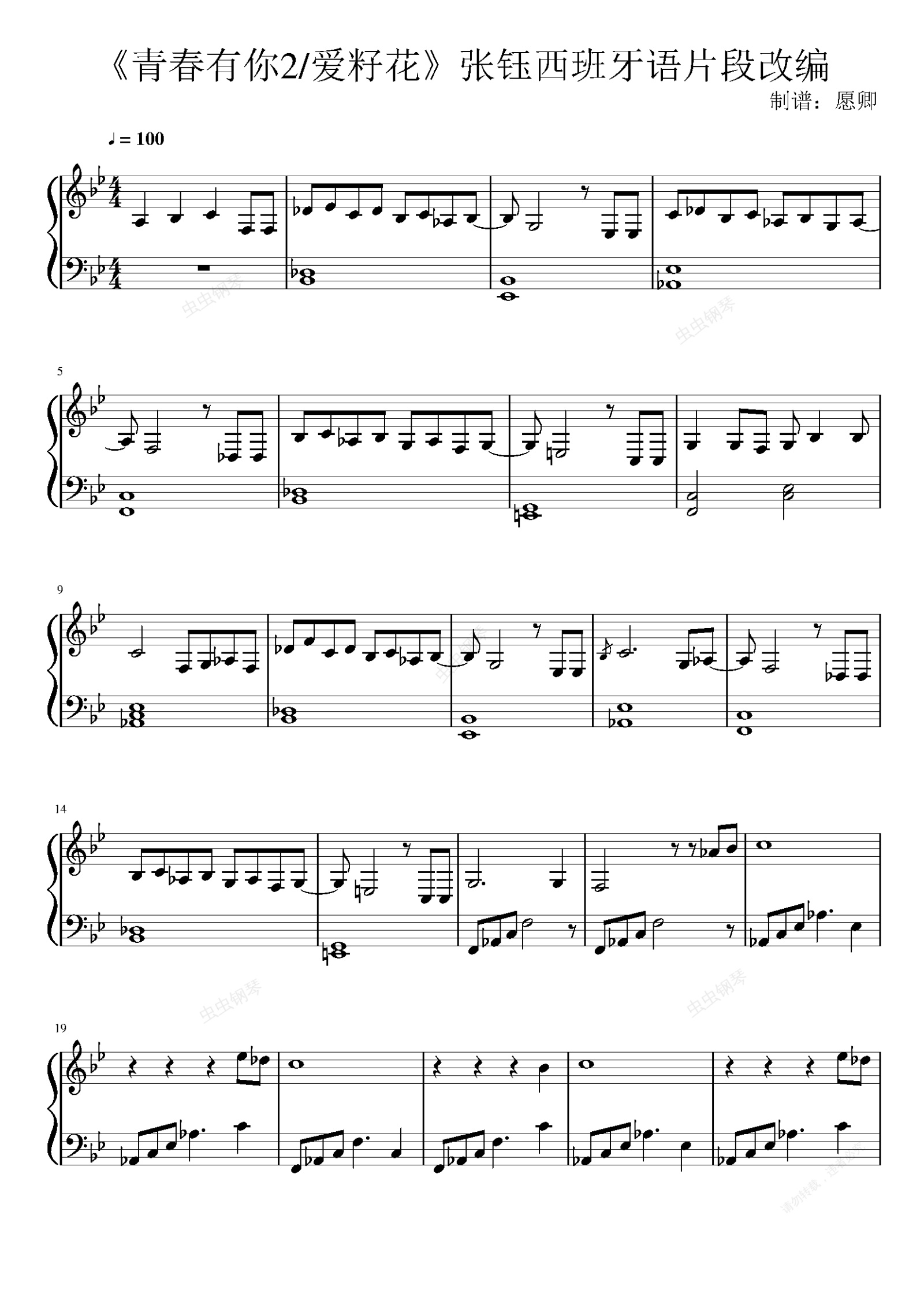 钢琴谱:《青春有你2/爱籽花》张钰西班牙语片段改编