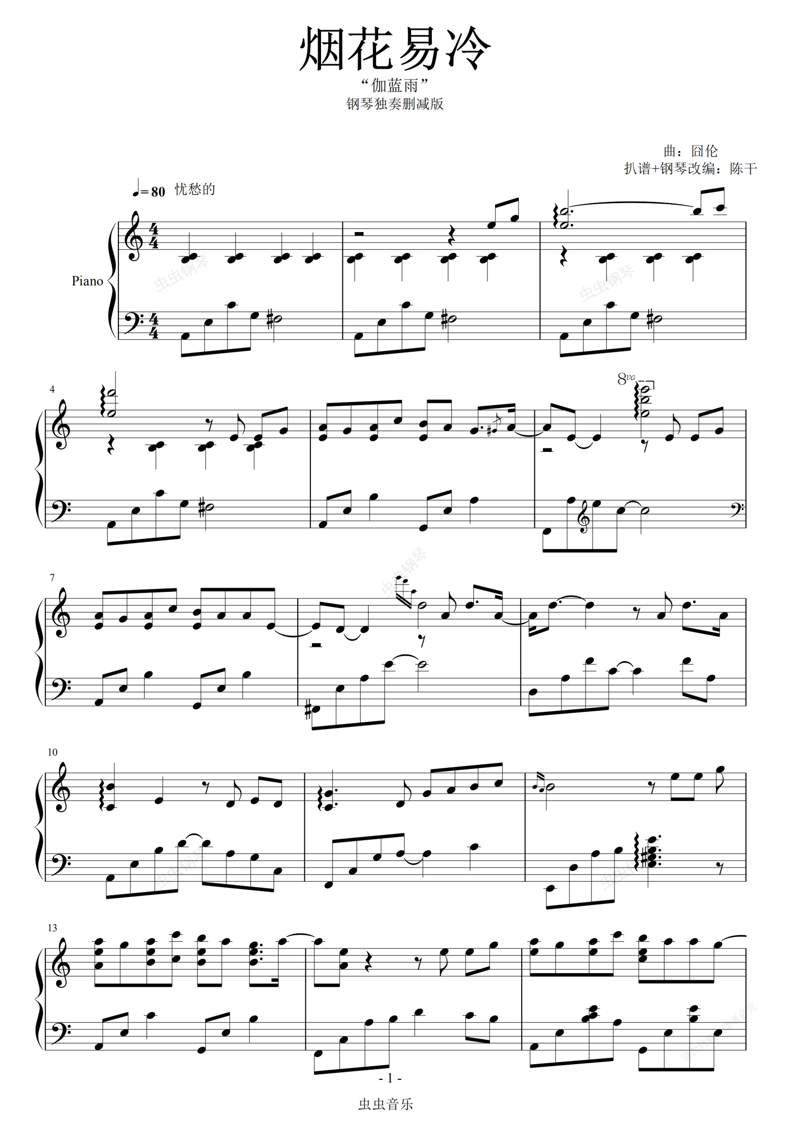 钢琴谱:《烟花易冷 》伽蓝羽钢琴独奏删减版