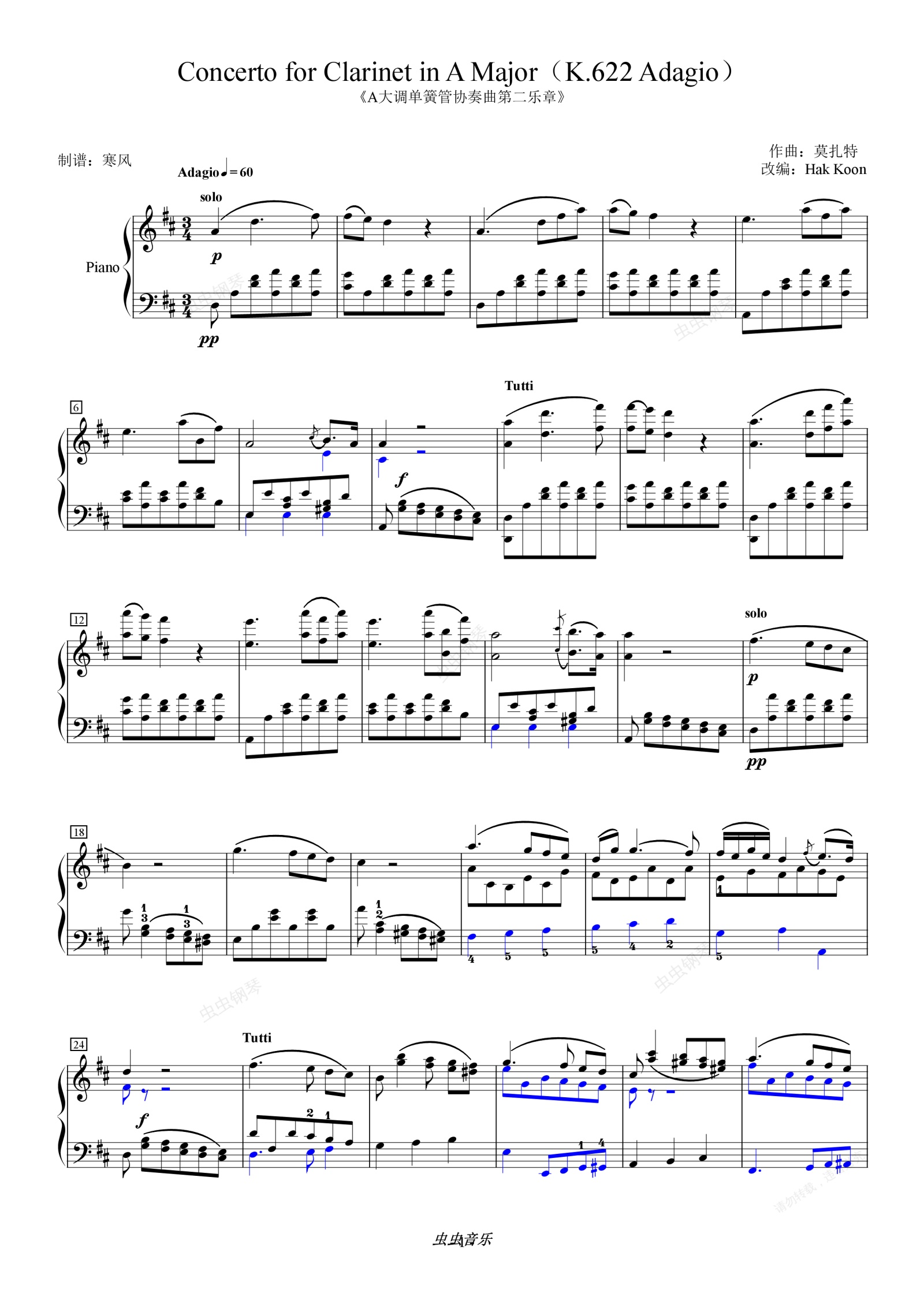 钢琴谱:莫扎特-A大调单簧管协奏曲第二乐章