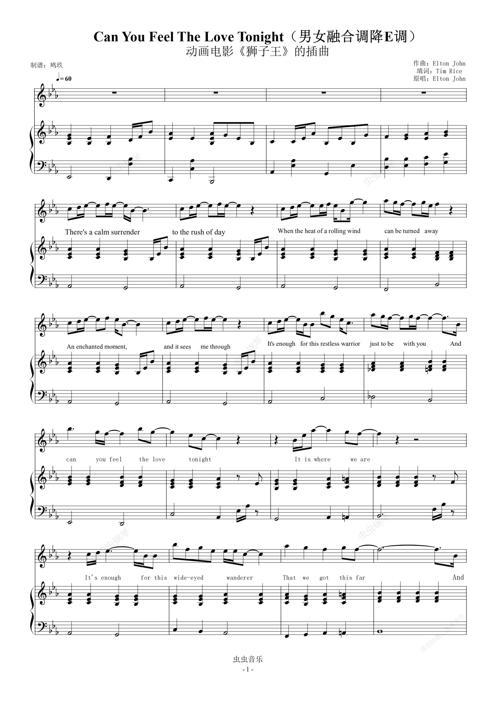钢琴谱:Can You Feel The Love Tonight 动画电影《狮子王》的插曲