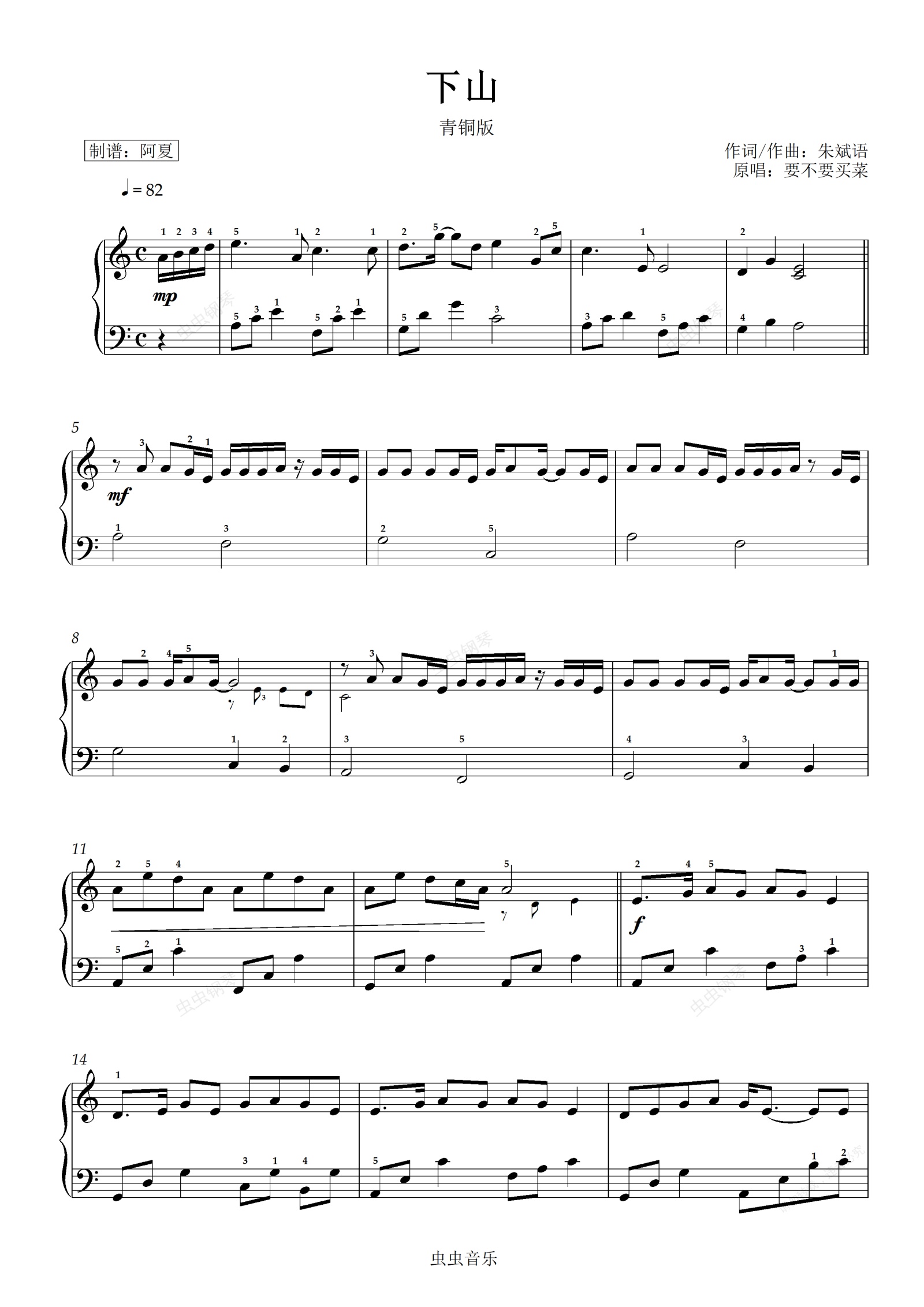 钢琴谱:下山 - 青铜(简易)版 - C调带指法