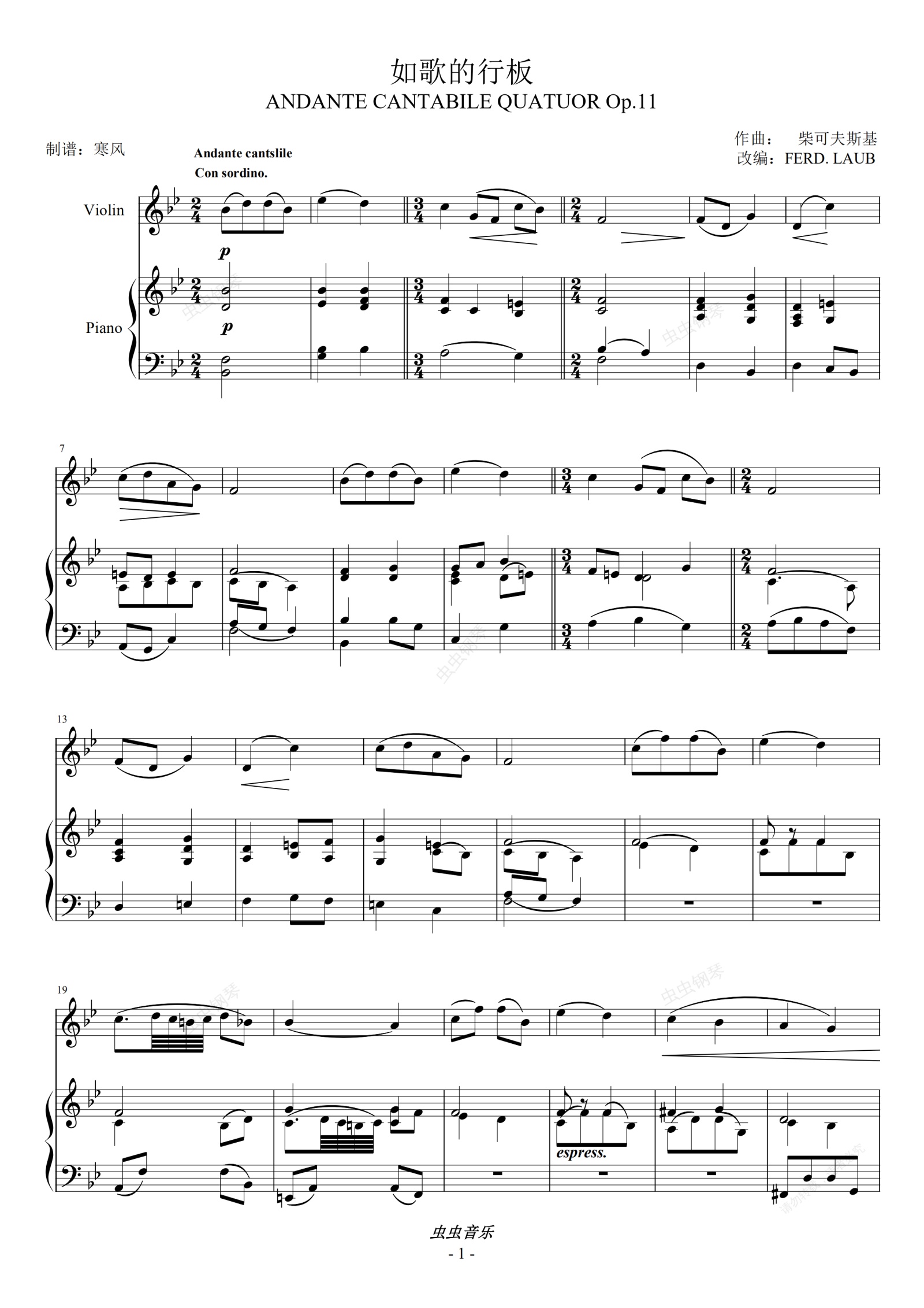 钢琴谱:柴可夫斯基-如歌的行板小提琴+钢琴