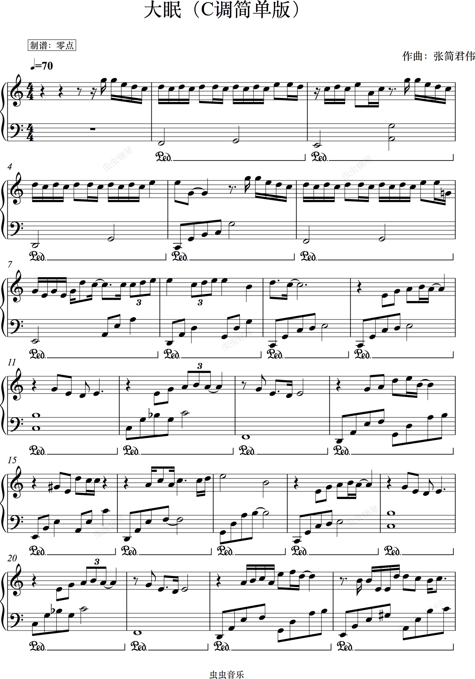 钢琴谱:大眠-C调简单版