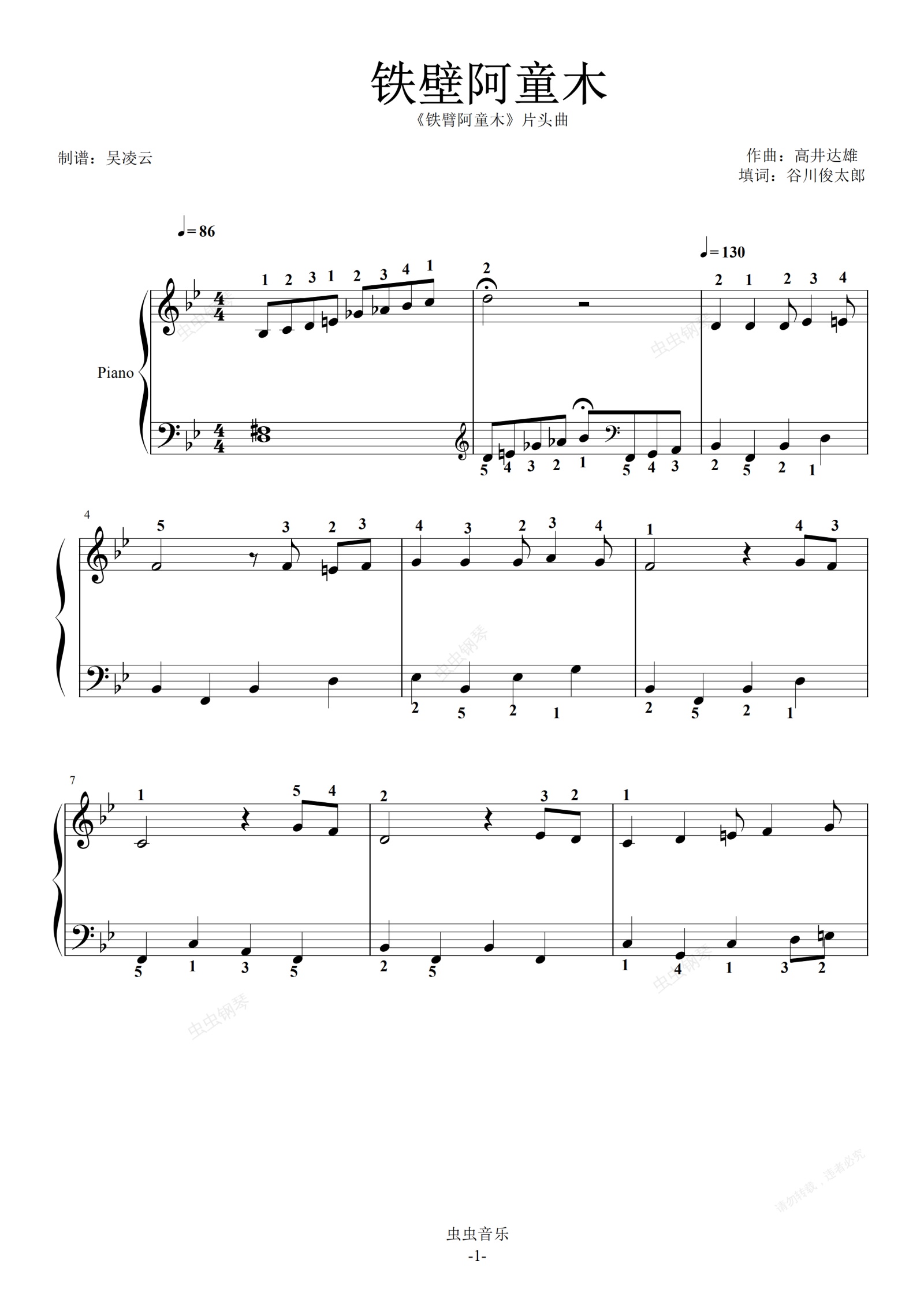 钢琴谱:铁壁阿童木 吴凌云现代钢琴基础教程 带指法 适合初学者