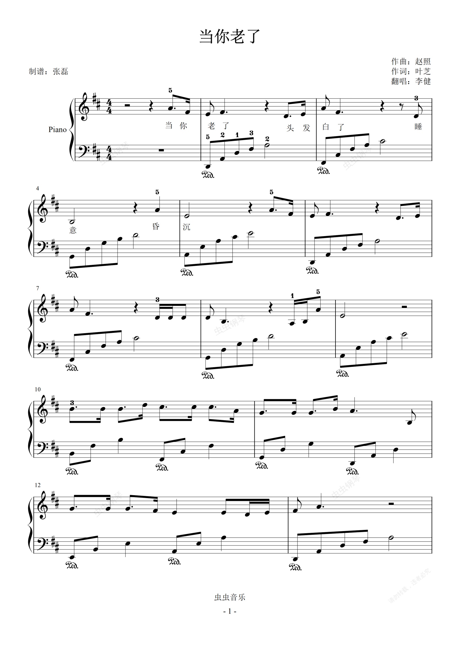 钢琴谱:当你老了-李健D大调