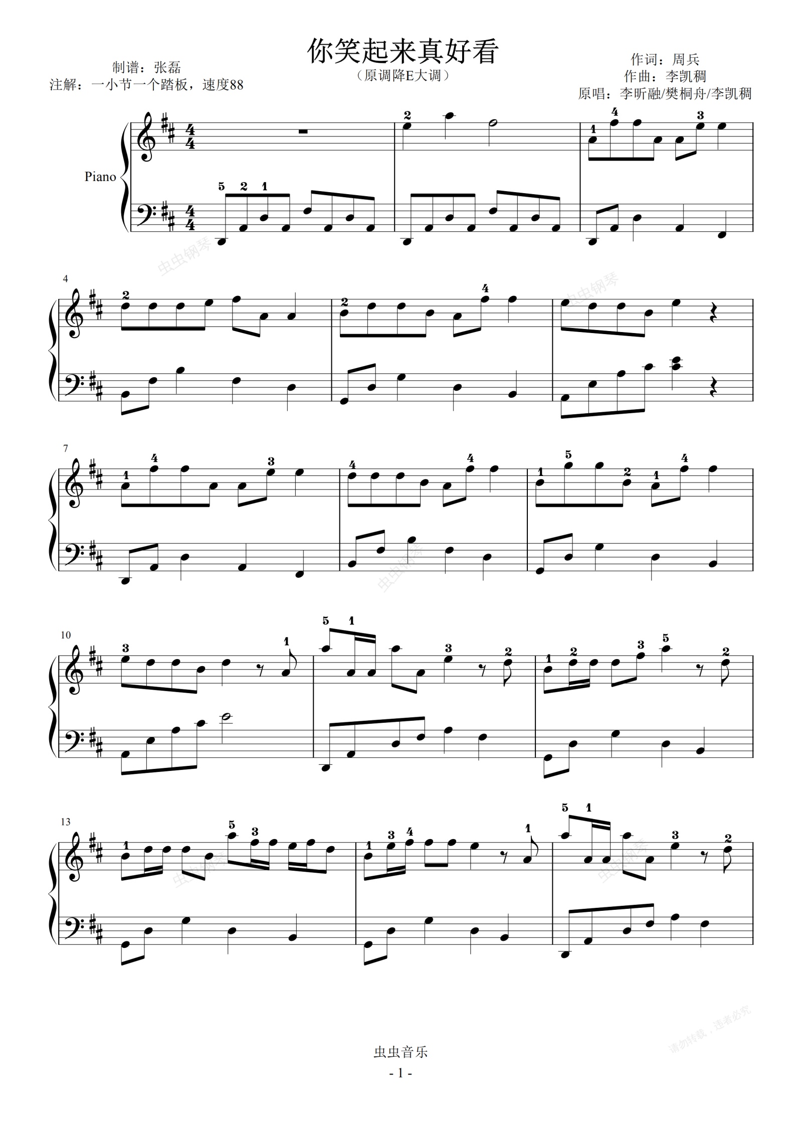 钢琴谱:你笑起来真好看-李昕融/樊桐舟/李凯稠D大调