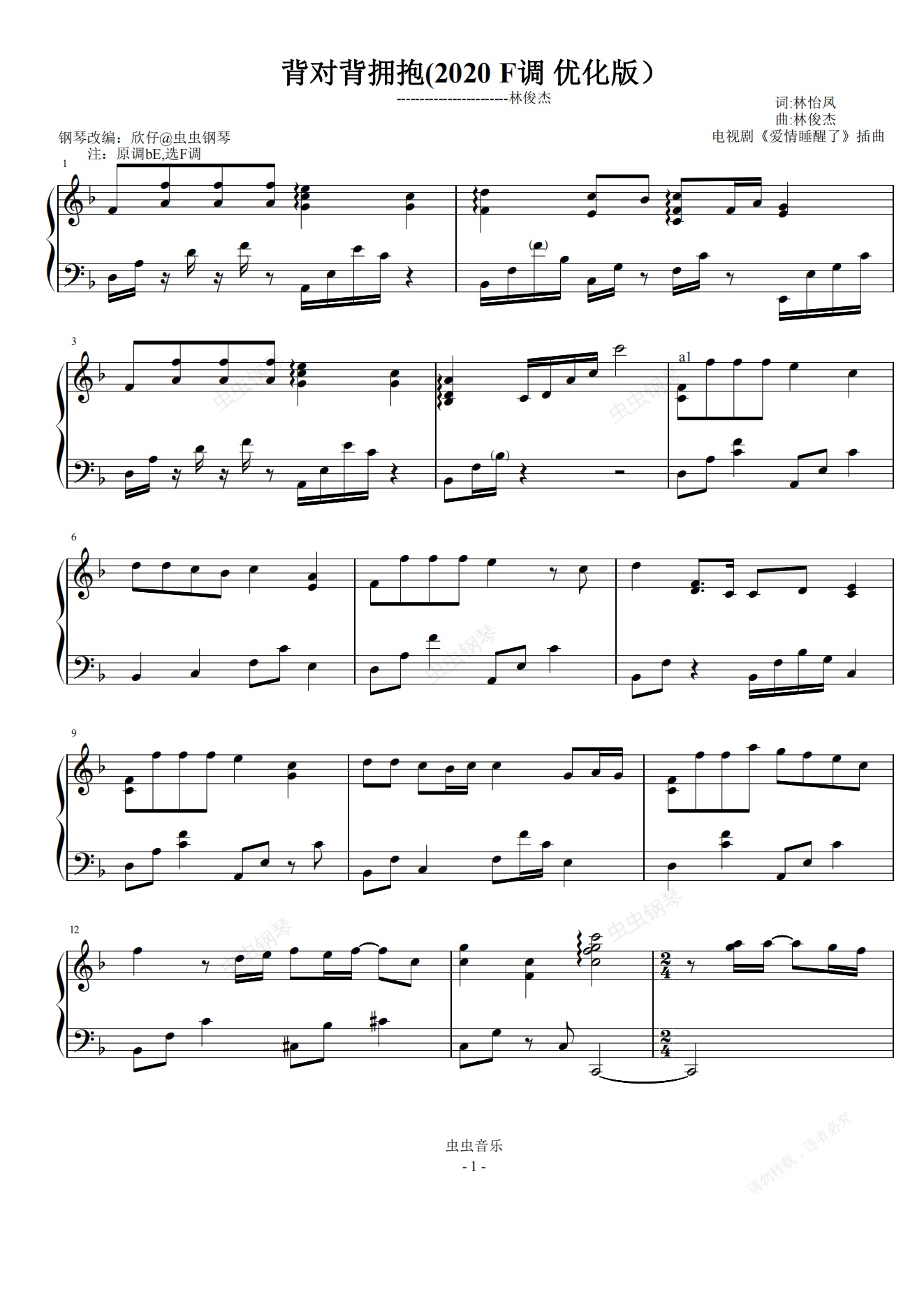钢琴谱:背对背拥抱(2020 F调 优化版)