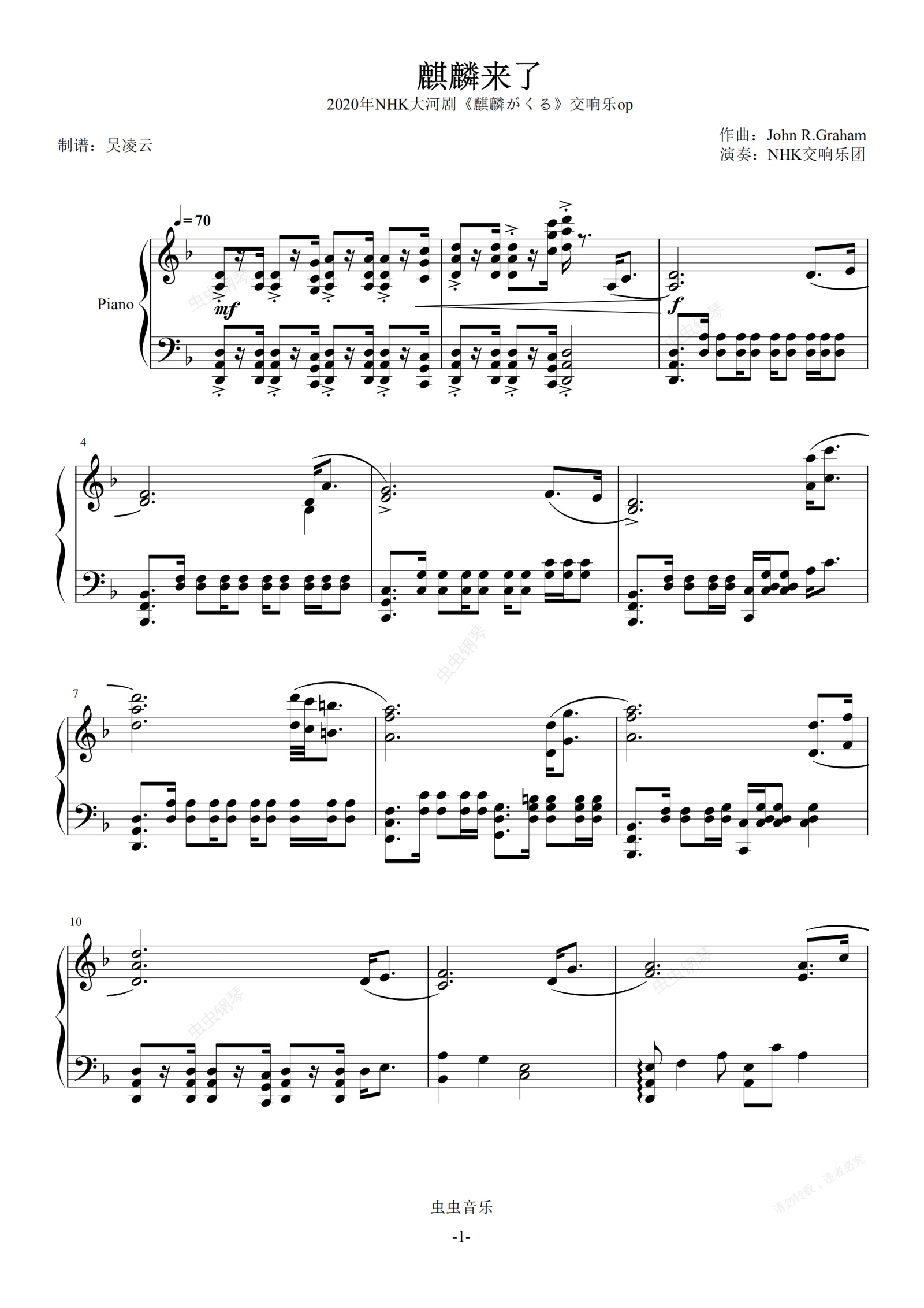 钢琴谱:麒麟来了 片头交响乐 2020日本大河剧 吴凌云编制版