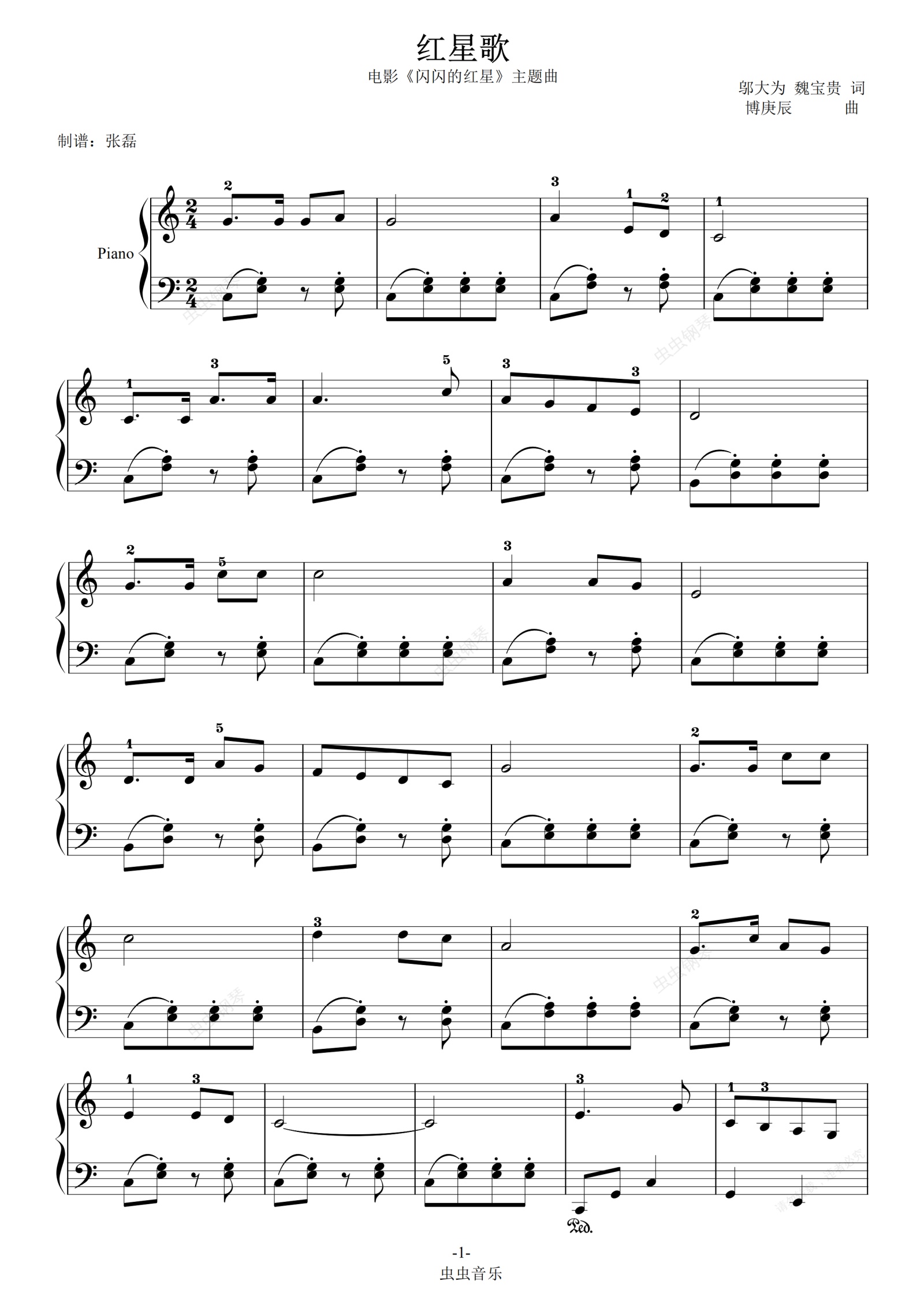 钢琴谱:红星歌--少儿歌曲-C大调